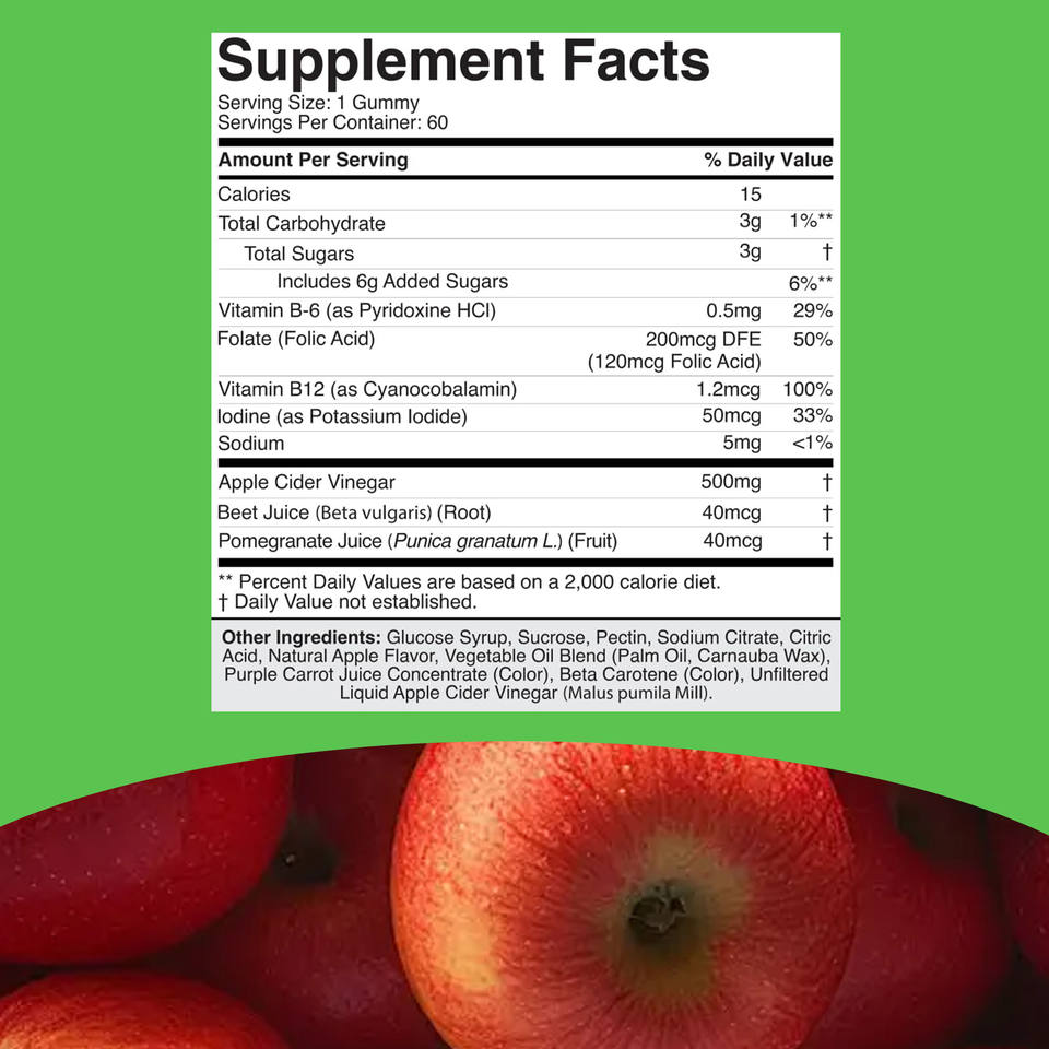 ส่วนผสมหลัก:น้ำส้มสายชูหมักจากแอปเปิล, น้ำบีทรูท, น้ำทับทิม, วิตามินบี 6, โฟเลต, วิตามินบี 12, ไอโอดีน