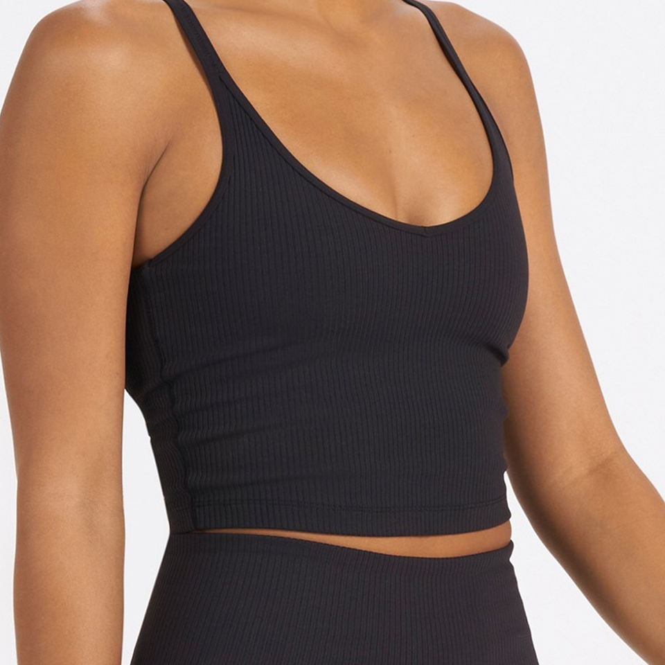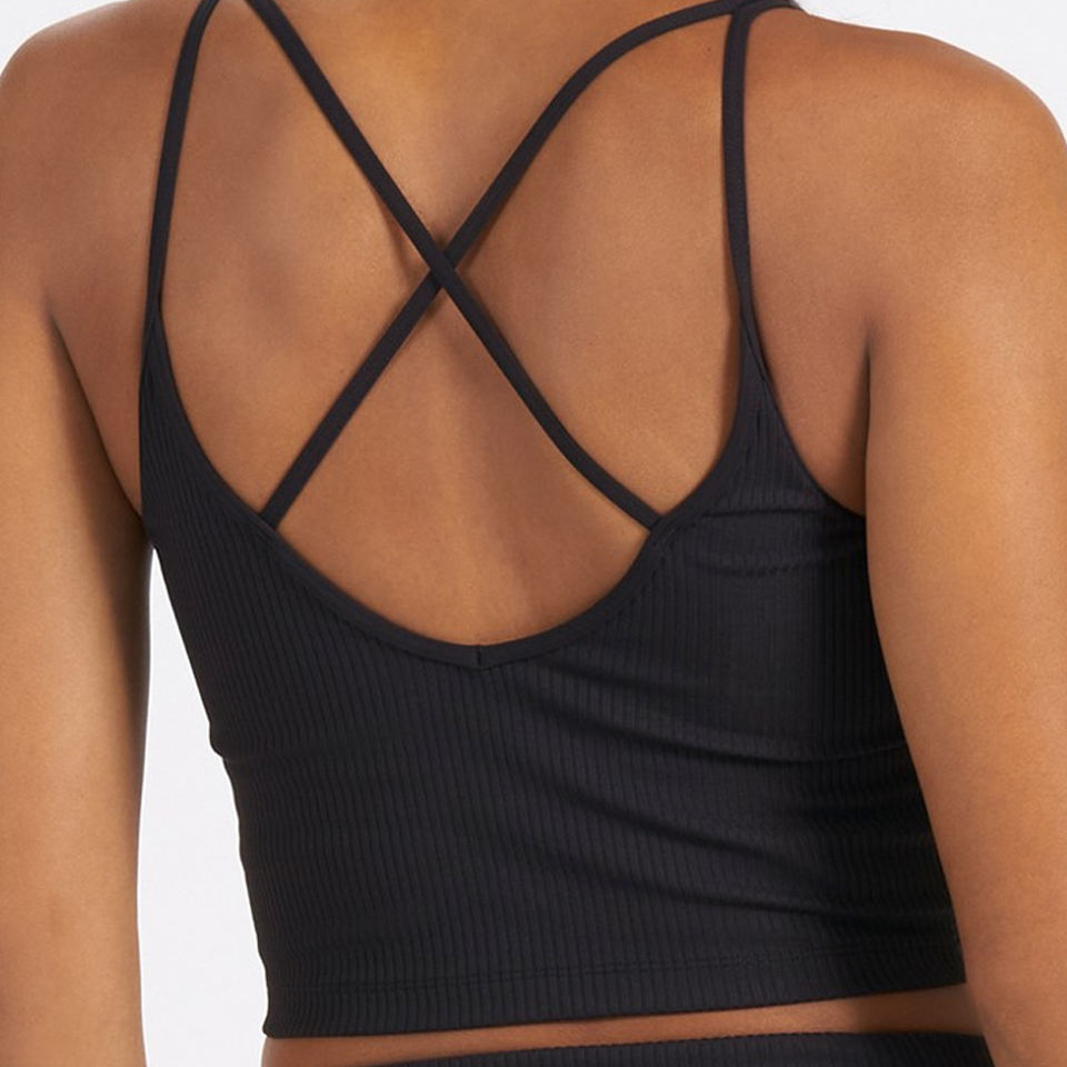 บราผ้าทอโครงสีดำพร้อมสายรัดบางๆและดีไซน์คอนทัวร์แบบมีโครงสร้างเพื่อการจัดแต่งทรงผมที่ไม่ซับซ้อน
