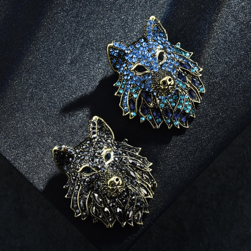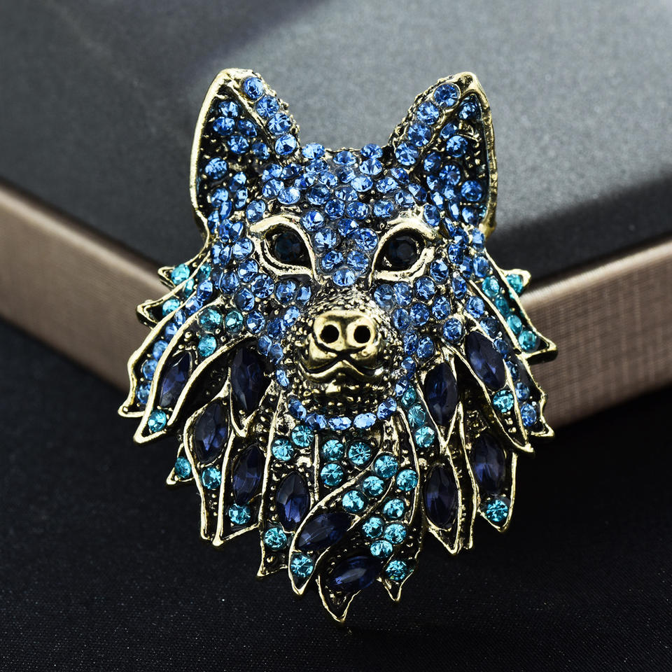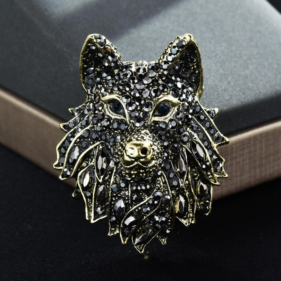 เข็มกลัดรูปหัวหมาป่าประดับคริสตัลไรน์สโตน ชุบทองโบราณและเงิน สำหรับงานแต่งงานและงานหมั้น