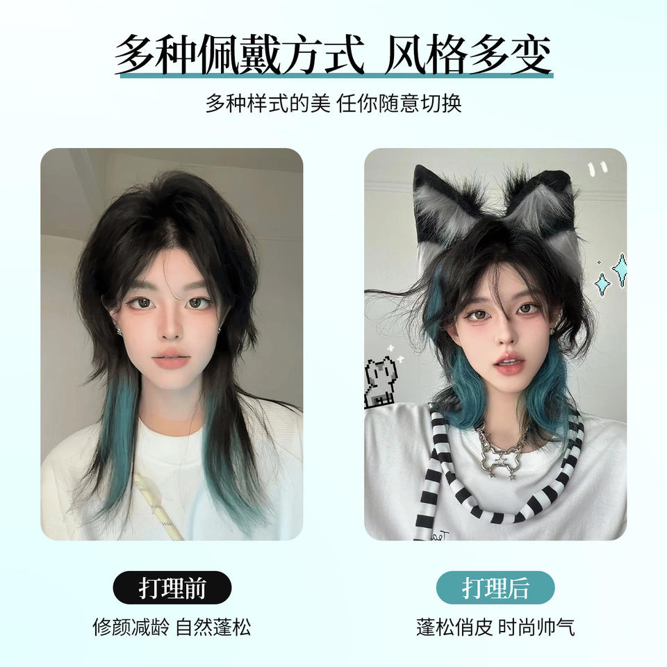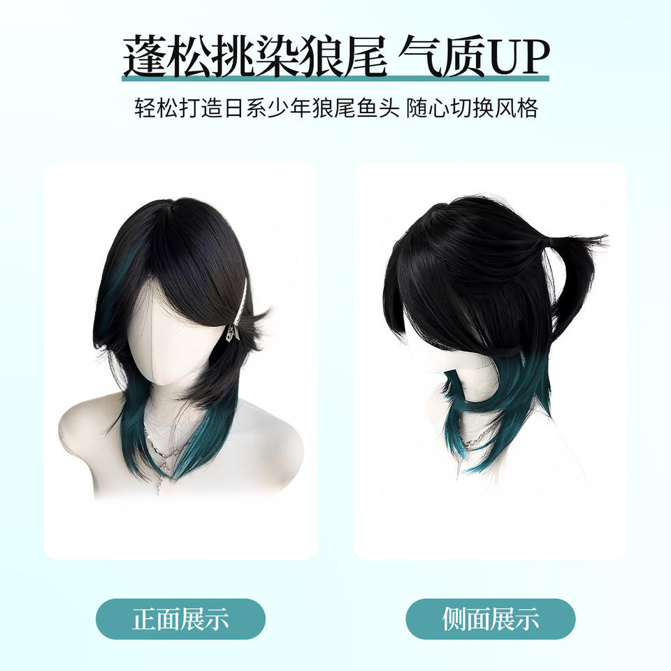 วิกผมซามูไรหางหมาป่า ยาวตรง สีเขียวไฮไลท์ เส้นใยคาเนคาลอน แนวผมธรรมชาติ คอสเพลย์ วิกผมเต็มศีรษะ