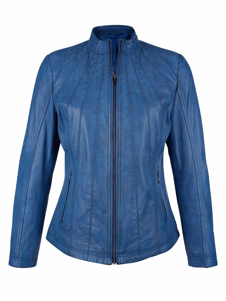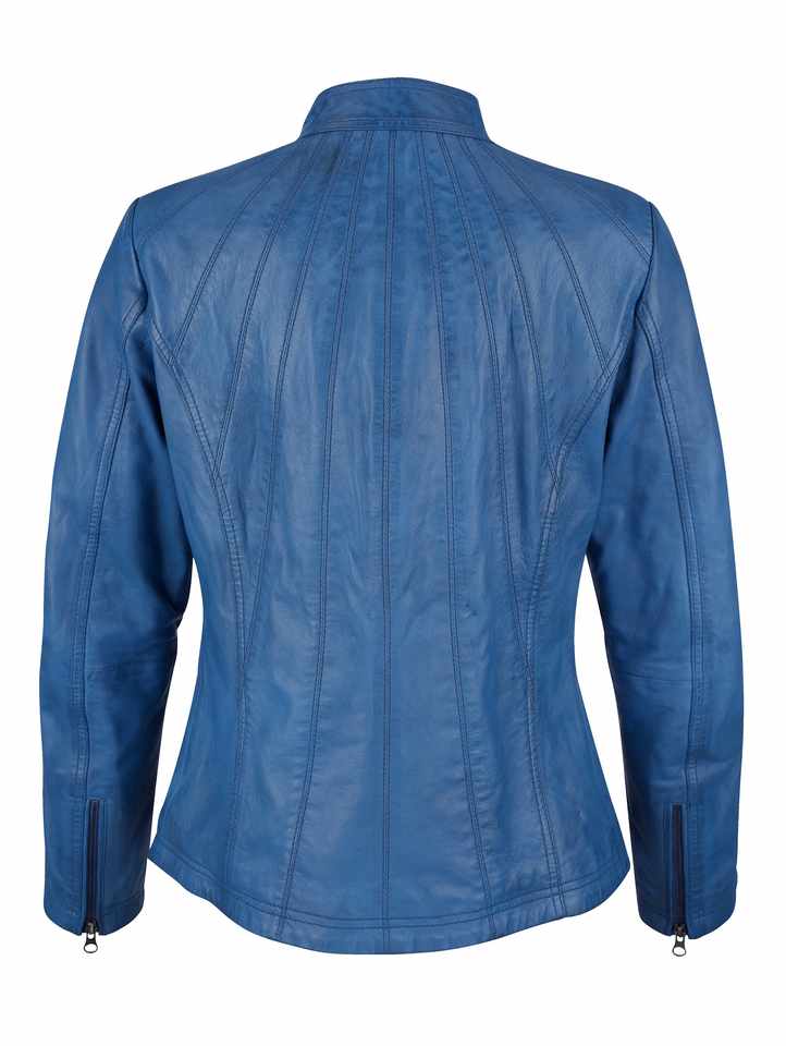 เสื้อแจ็คเก็ตบอมเบอร์หนังแท้สีน้ำเงินสำหรับผู้หญิง ระบายอากาศได้ดี พร้อมปกตั้ง สำหรับใช้ในชีวิตประจำวัน