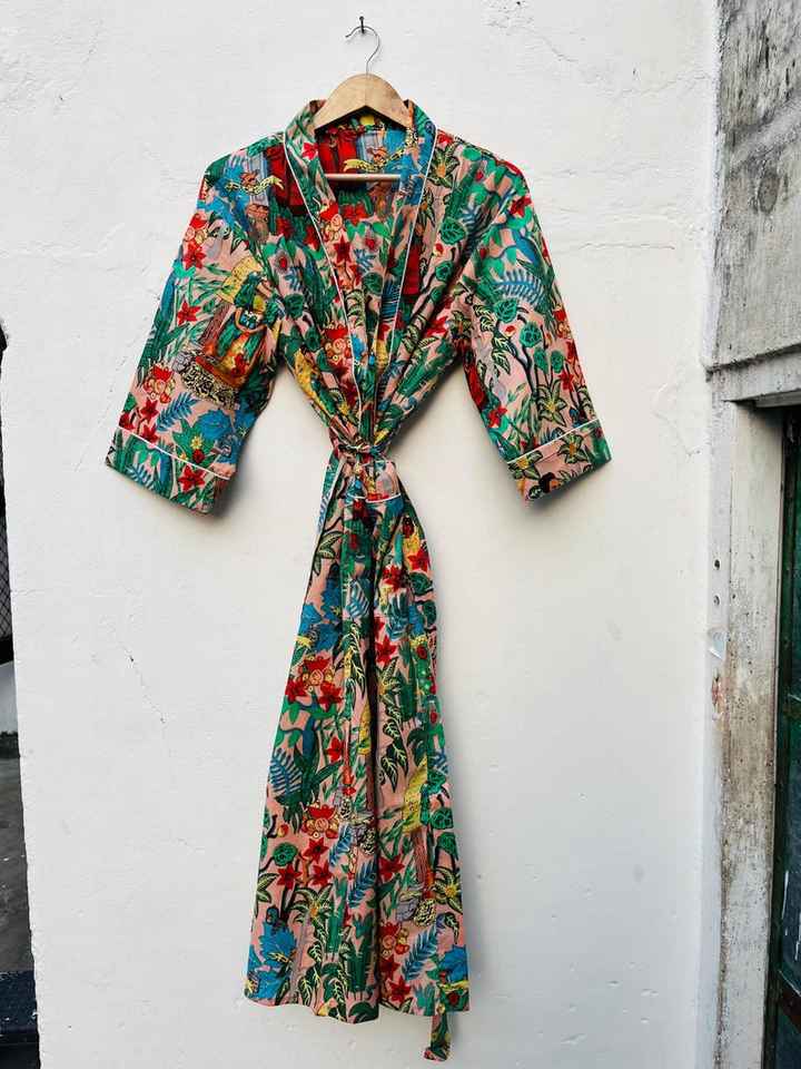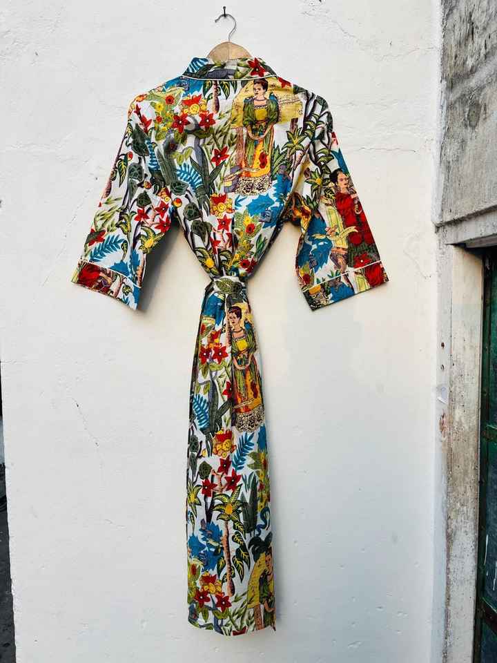 ชุดคลุมสไตล์กิโมโนผ้าฝ้ายสำหรับผู้หญิง ลายดอกไม้พิมพ์มือ ออกแบบมาเพื่อการนอนหลับสบาย ใช้พักผ่อนและใช้ในชีวิตประจำวัน