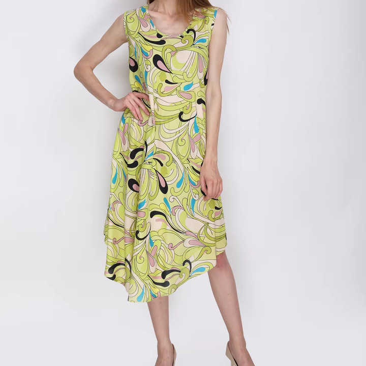 ชุดเดรสทรงร่มผ้าเครปสำหรับวันหยุดของผู้หญิงชุดเดรสชายหาดแขนกุดลำลองพิมพ์ลายดิจิทัลสำหรับฤดูร้อน
