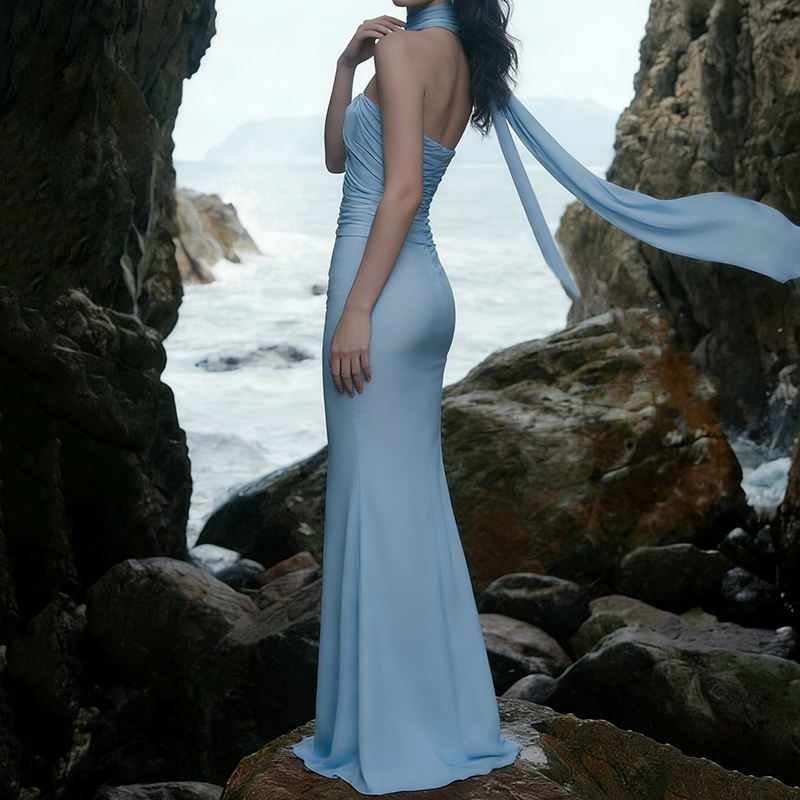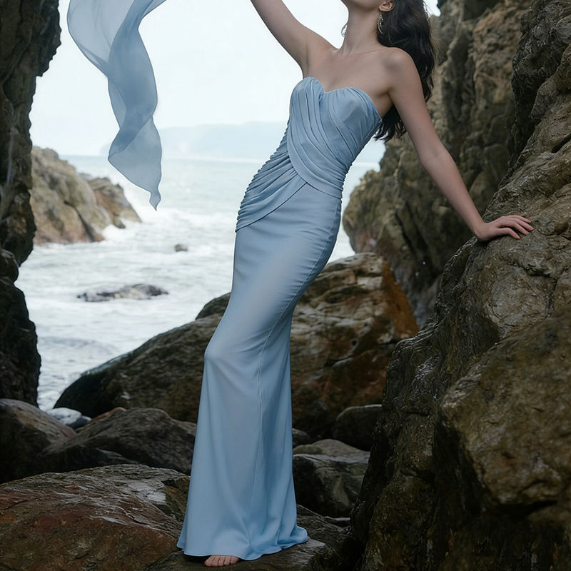 เดรสยาวสีน้ำเงินแบบไร้สายสำหรับผู้หญิง ดีไซน์จับจีบและคอรูปหัวใจ เหมาะสำหรับงานปาร์ตี้ฤดูร้อนและงานกลางคืน