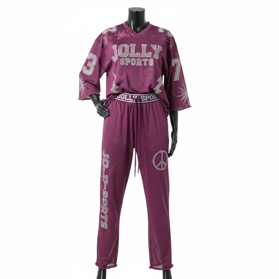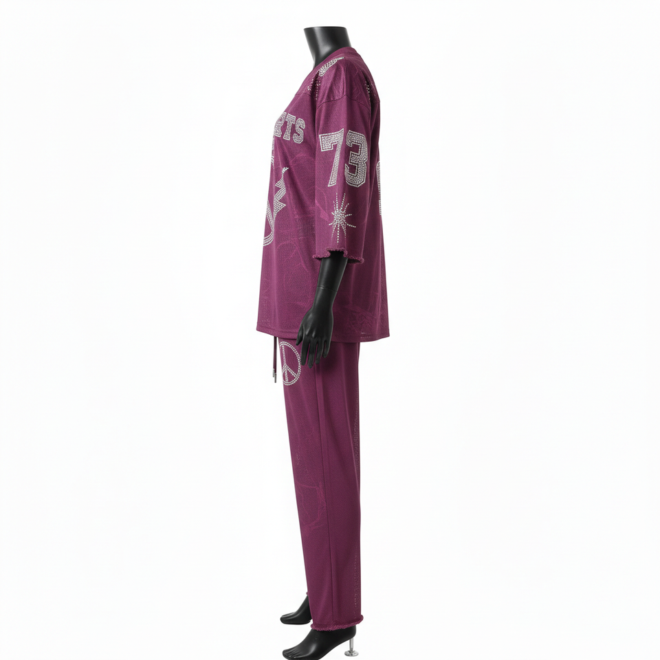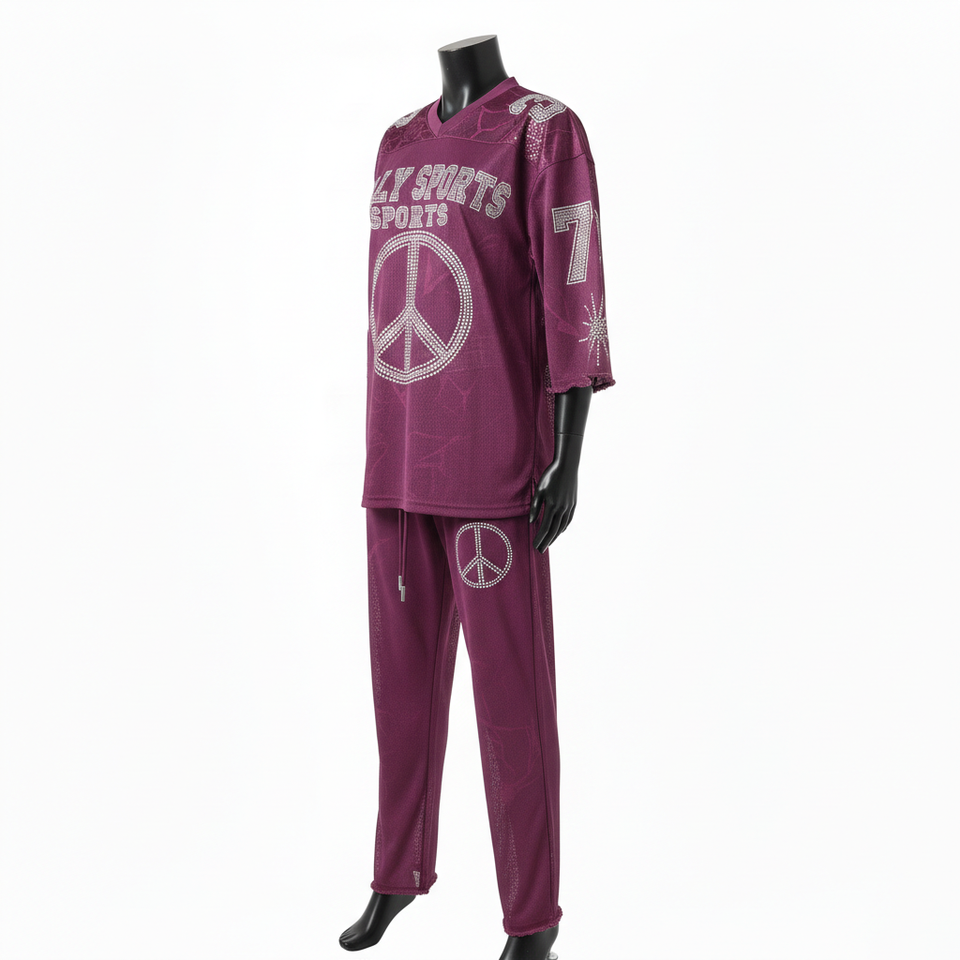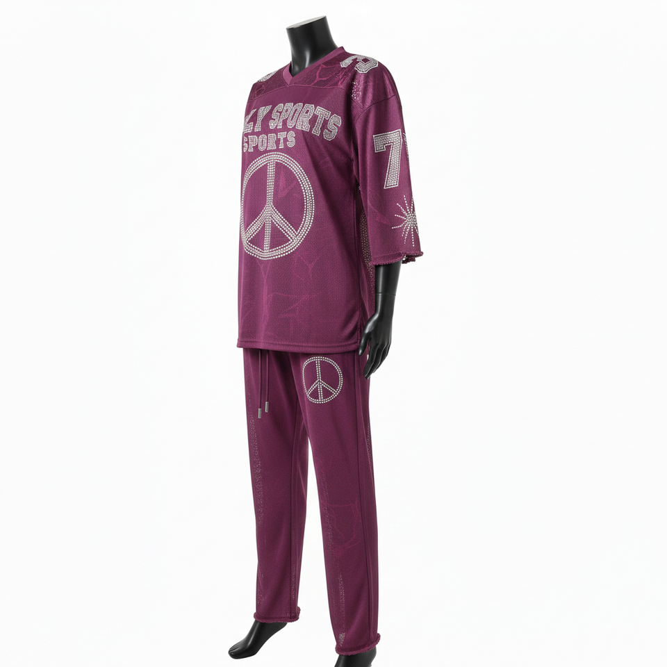 ชุดเสื้อและกางเกงผ้าเจอร์ซีย์โพลีเมชเนื้อนุ่ม 180 GSM สีพลัม พิมพ์ลายแบบ Sublimation พร้อมโลโก้ประดับเพชร ชุดเซ็ตสำหรับผู้หญิง