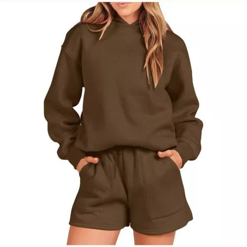 ชุดเซ็ต 2 ชิ้นสำหรับผู้หญิง เสื้อฮู้ดแขนยาวทรงโอเวอร์ไซส์ และกางเกงขาสั้น ชุดวอร์ม ชุดเซ็ตผู้หญิง รับผลิตตามสั่ง ขายส่ง