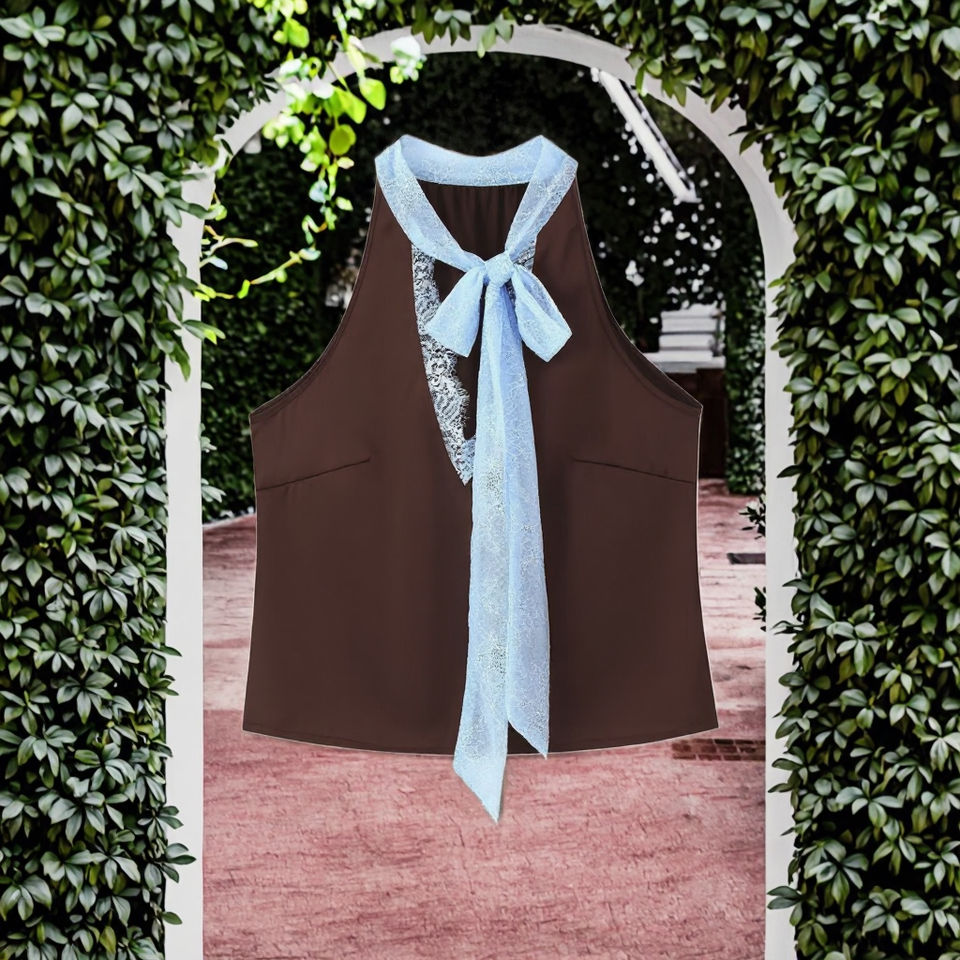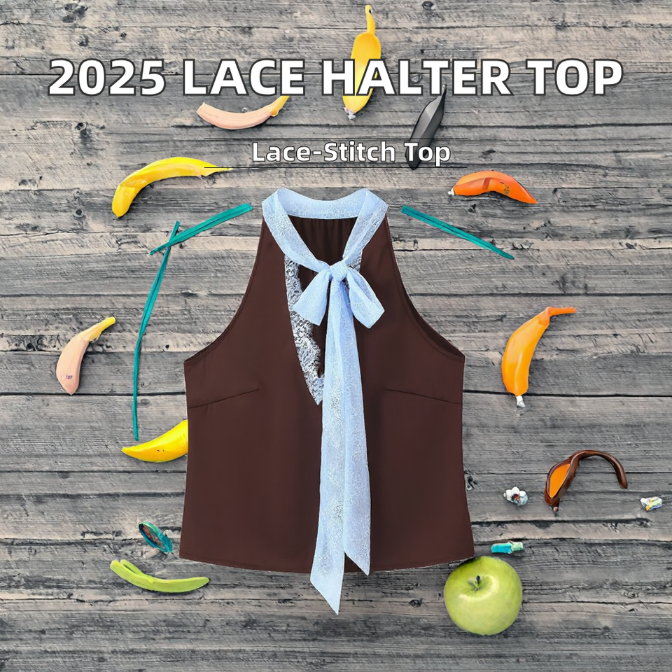 เสื้อครอปผู้หญิงแฟชั่นใหม่ประจำฤดูใบไม้ร่วงปี 2025 แบบรักษ์โลก ระบายอากาศได้ดี ตกแต่งด้วยลูกไม้ คอวีผูกหลัง สไตล์วินเทจ แขนกุด ลำลอง