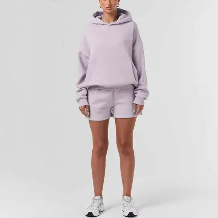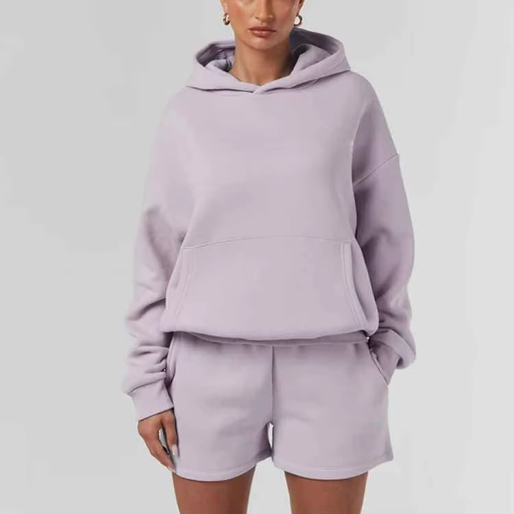 ชุดเซ็ตเสื้อฮู้ดดี้และกางเกงขาสั้นเหนือเข่าสำหรับผู้หญิง ทรงปกติ ผ้าแคนวาสเนื้อแน่น ระบายอากาศได้ดี สวมใส่สบาย เหมาะสำหรับฤดูร้อน
