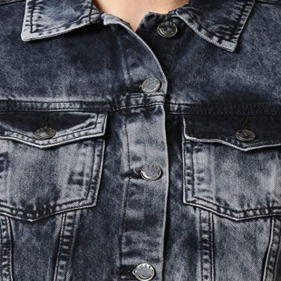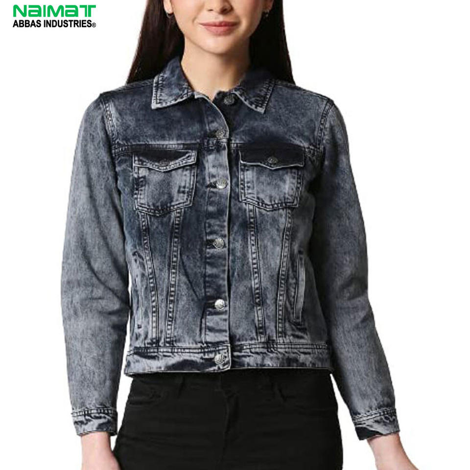 เสื้อแจ็คเก็ตเดนิมถักผ้าฝ้ายสีเทาฟอกกรดสำหรับผู้หญิง สไตล์วินเทจลำลอง เป็นมิตรกับสิ่งแวดล้อม แขนยาว ทรงเข้ารูป แฟชั่นเสื้อคลุมคลาสสิก