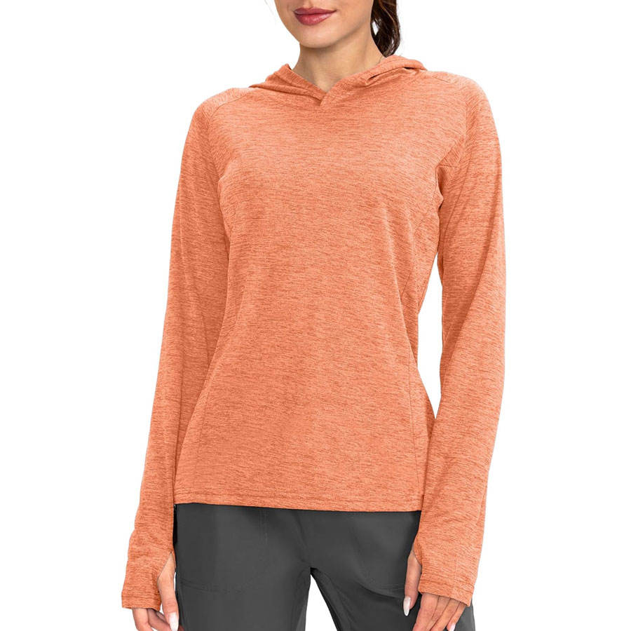 ผู้หญิงที่ใช้งานเสื้อกันหนาวหมวกขนแกะนุ่มแขนยาวน้ําหนักเบาเสื้อกันหนาวหมวกท่องเที่ยวขนสัตว์ Merino เสื้อฮู้ดหลุมนิ้วหัวแม่มือ