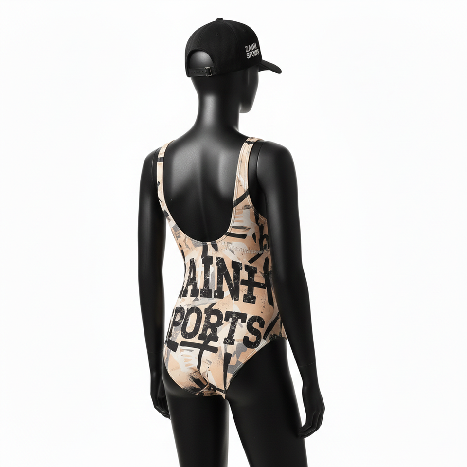 ชุดว่ายน้ำวันพีซสำหรับผู้หญิง ผ้าโพลีเอสเตอร์ผสมสแปนเด็กซ์ ยืดหยุ่นสูง ลายพิมพ์กลางๆ สายรัดข้าง พร้อมโลโก้ เหมาะสำหรับใส่อาบน้ำ
