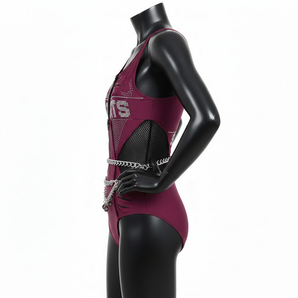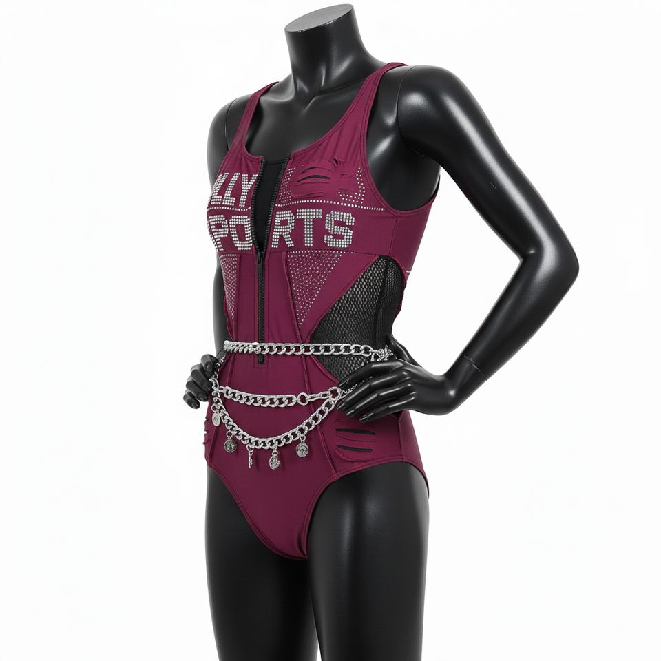 ชุดว่ายน้ำผู้หญิง ผ้าไนลอนสแปนเด็กซ์พรีเมียม 220 GSM แผงตาข่ายสีแดงเบอร์กันดี โลโก้ประดับเพชร ชุดว่ายน้ำผู้หญิงแบบสั่งทำ