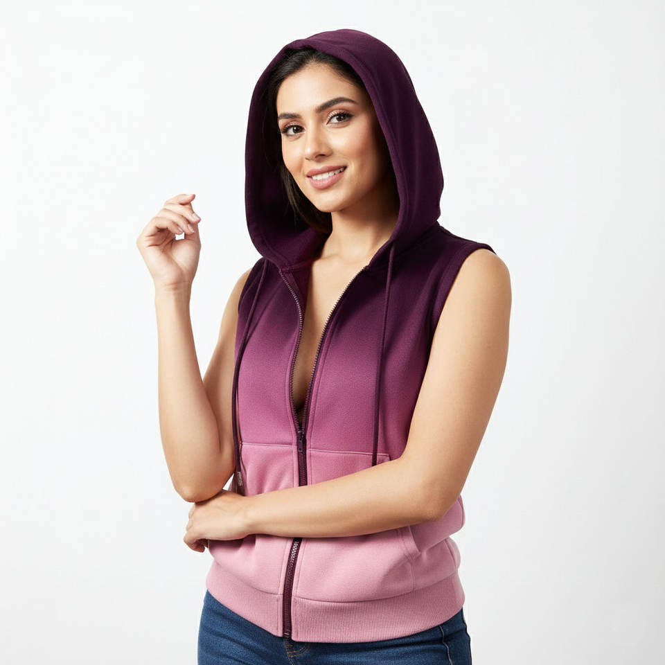เสื้อกีฬาผู้หญิงแบบไม่มีแขน มีฮู้ด ซิป ทรงปกติ รับผลิตแบบ OEM ราคาขายส่ง ปรับแต่งโลโก้ สี ขนาด และแบรนด์ของตัวเอง เสื้อกั๊กมีฮู้ด