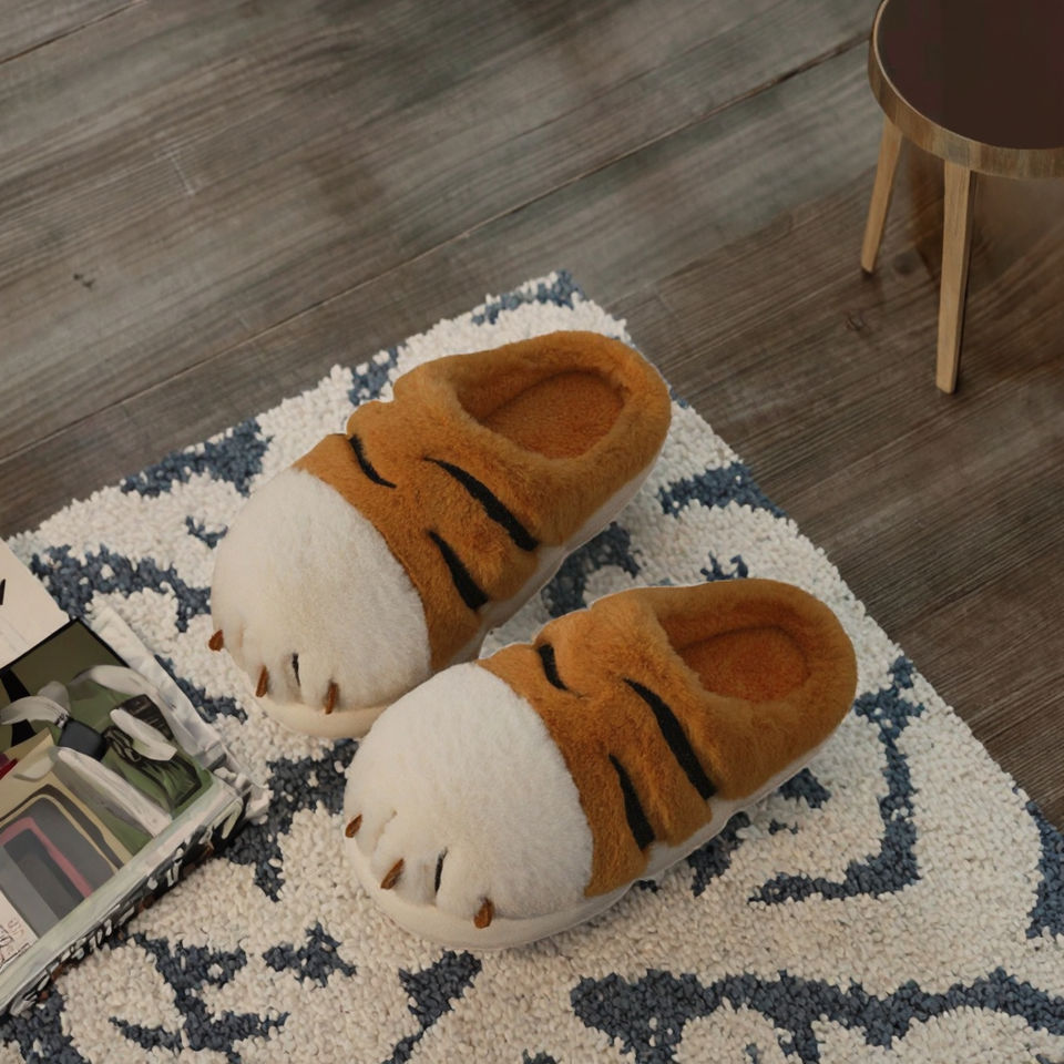 รองเท้าแตะผู้หญิงสำหรับฤดูใบไม้ร่วงและฤดูหนาว อุ่นสบาย น่ารัก สนุกสนาน ใส่ในบ้าน พื้นรองเท้า EVA นุ่ม ลายอุ้งเท้าเสือการ์ตูน