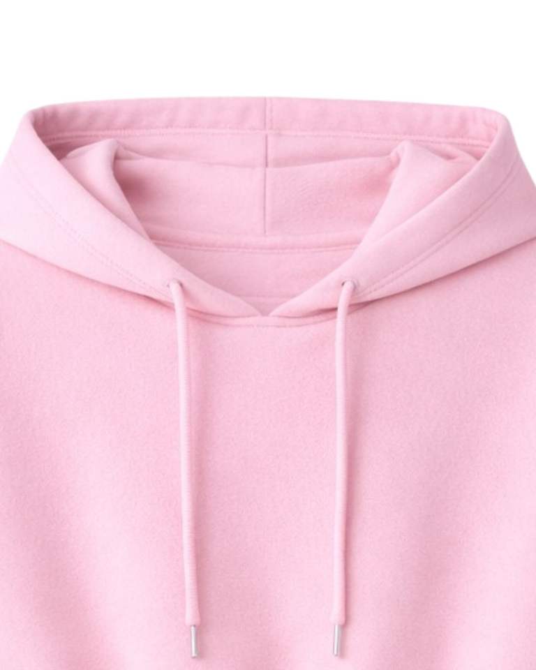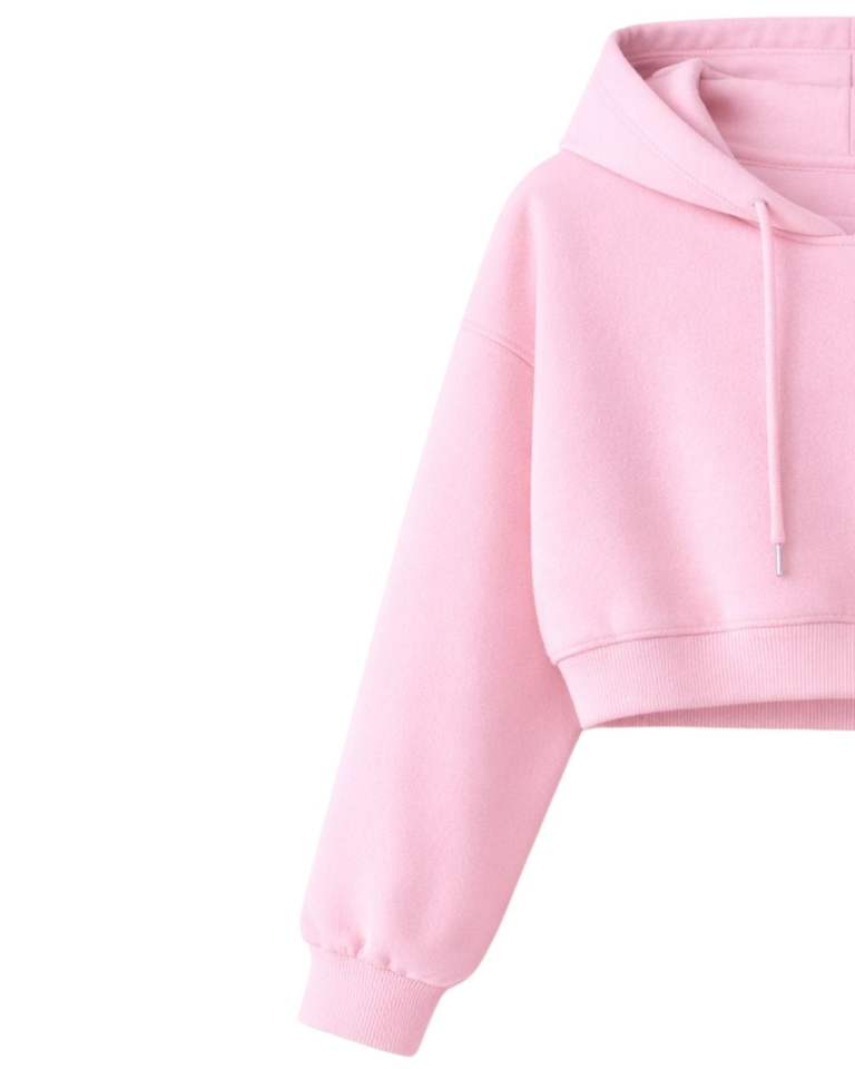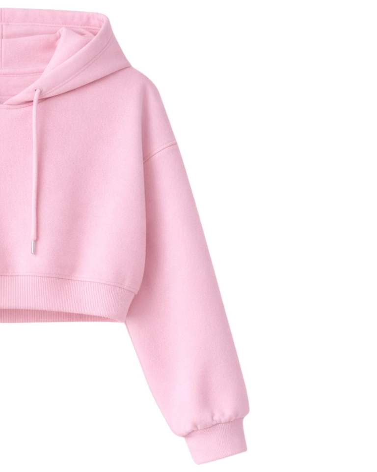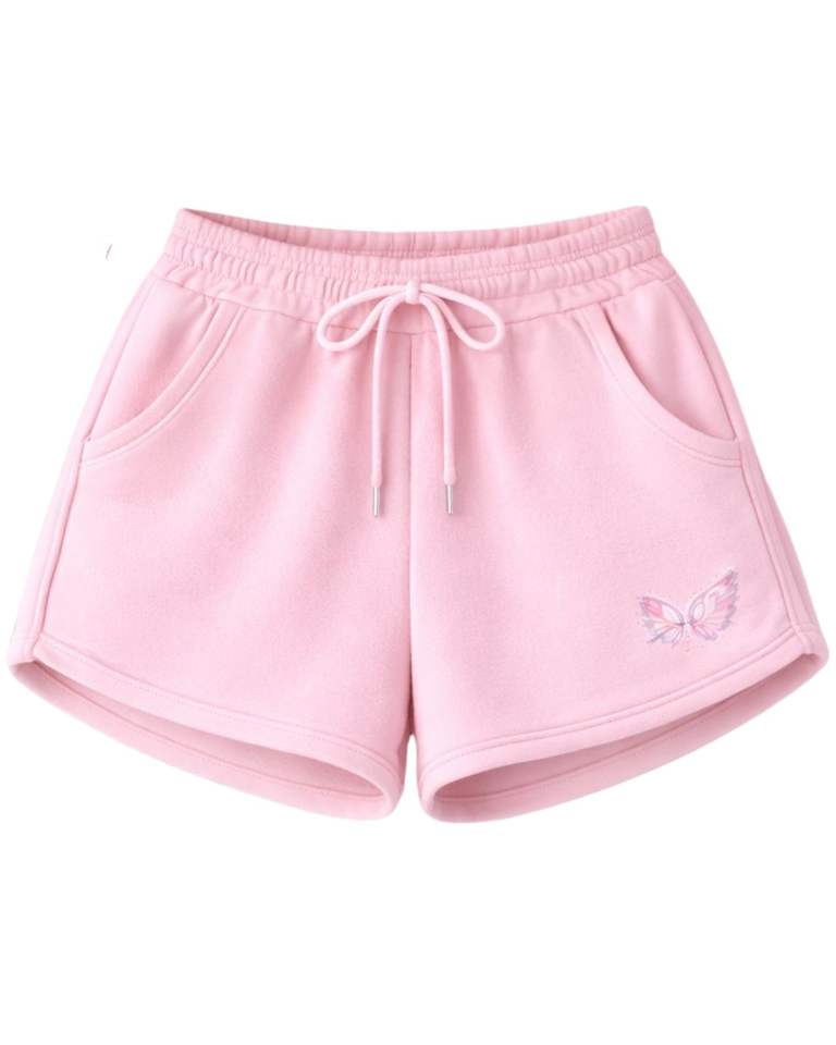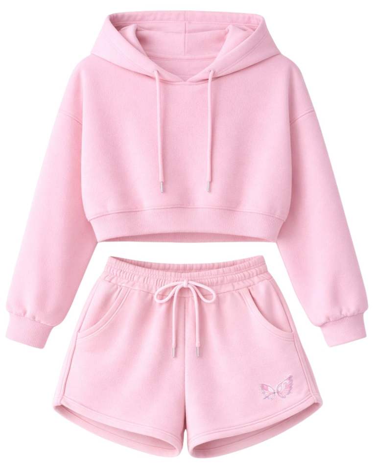 ชุดเซ็ตเสื้อครอปฮู้ดดี้สีชมพูอ่อนลายผีเสื้อ กางเกงขาสั้นลำลองสองชิ้น ผ้าฝ้ายฟลีซ ชุดลำลองสำหรับผู้หญิง ขายส่งจากโรงงาน