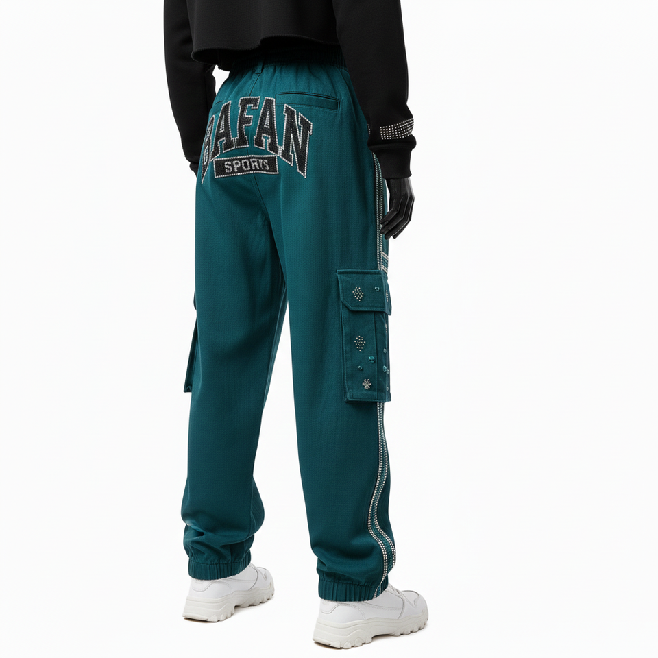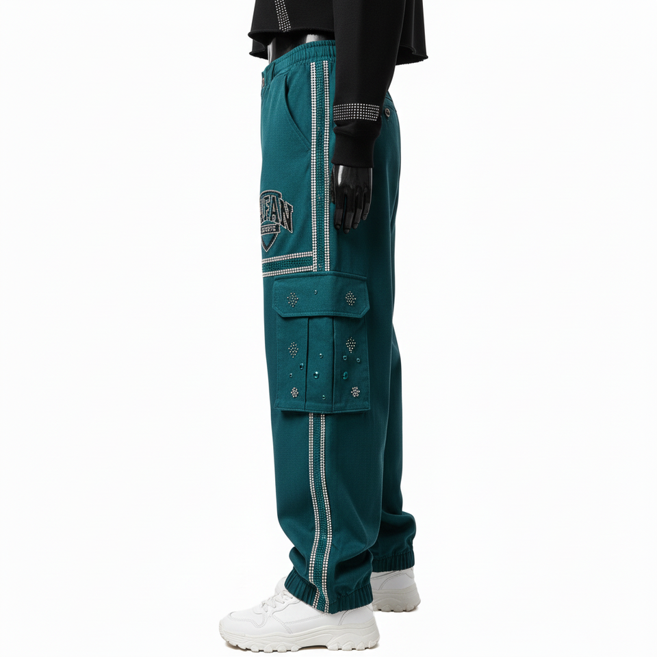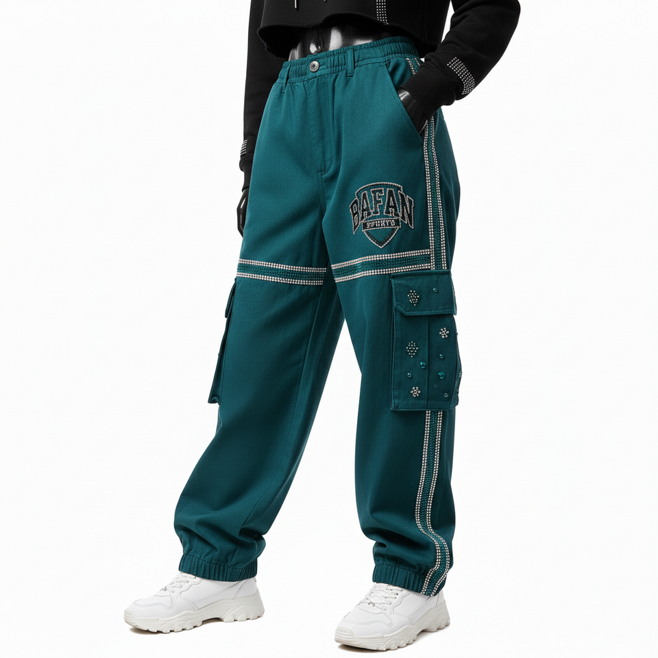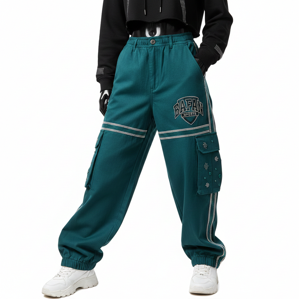 Women Baggy Pant Heavy Cotton Blend Twill Fabric 290 GSM Teal Green Utility Panel Cargo Style Custom Logo Baggy Pants For Sale