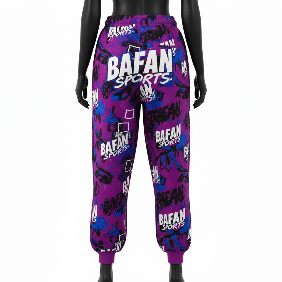 กางเกงขายาวทรงแบ็กกี้สำหรับผู้หญิง ผ้าพรีเมียม 280 GSM ผ้าฝ้ายผสมโพลีเอสเตอร์เนื้อนุ่ม สีม่วง พิมพ์ลายแบบซับลิเมชั่นทั้งตัว รับสกรีนโลโก้ กางเกงขายาวทรงแบ็กกี้สำหรับขาย