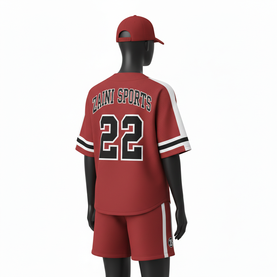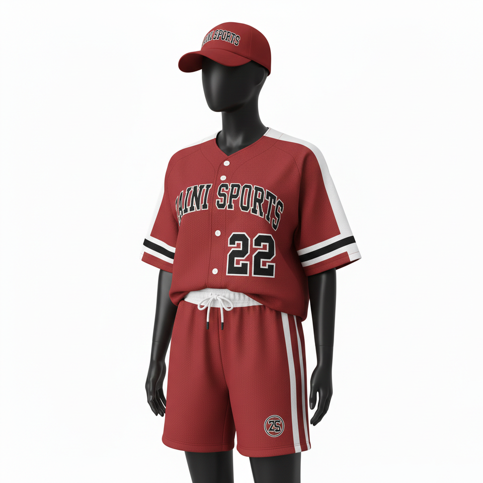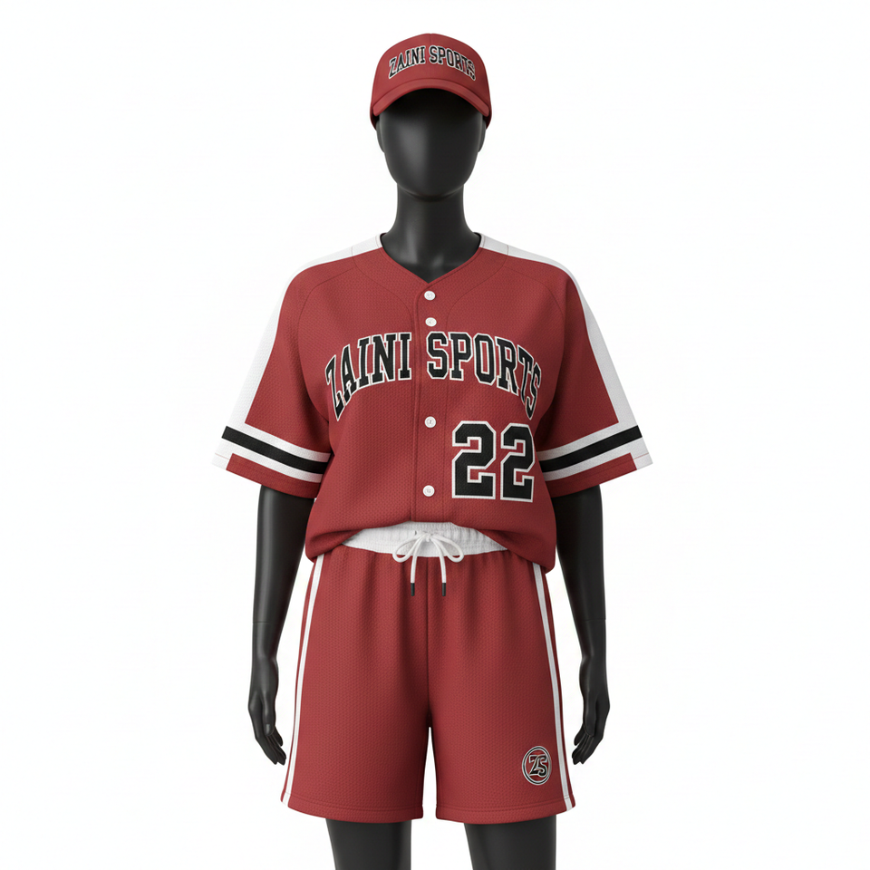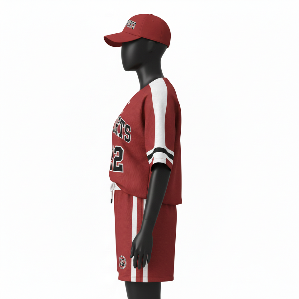 ชุดเบสบอลหญิง ผ้าโพลีเอสเตอร์เนื้อนุ่ม ระบายอากาศได้ดี 150 GSM ซับเหงื่อ สีแดงขาว แถบข้าง ปักโลโก้ตามสั่ง ชุดสำหรับผู้หญิง