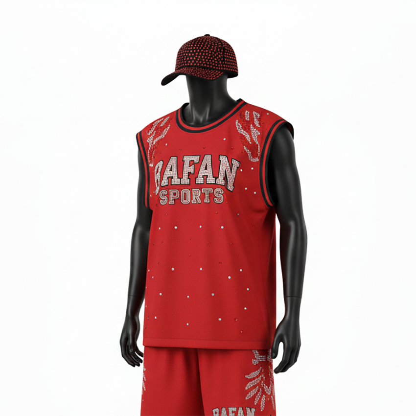 เสื้อบาสเก็ตบอลหญิง ผ้าโพลีเอสเตอร์ตาข่าย ระบายอากาศ น้ำหนักเบา สีแดง แบบไม่มีแขน ดีไซน์ขอบตกแต่ง รับสกรีนโลโก้ ผ้าฝ้าย