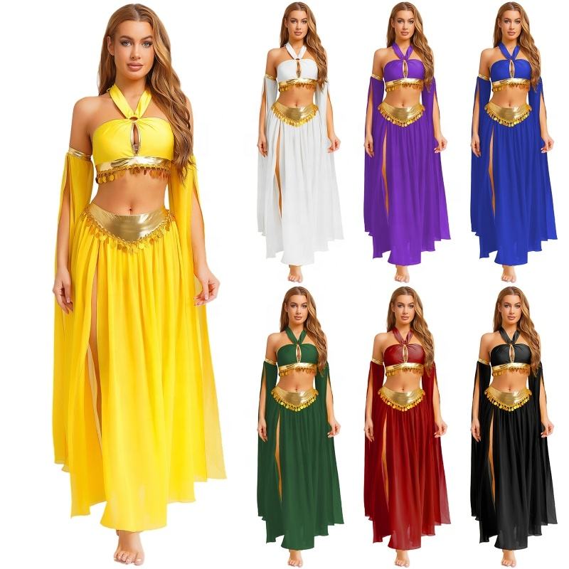 ชุดเต้นระบำหน้าท้องสำหรับผู้หญิงชุดครอปมีกางเกงในกระโปรงผ้าชีฟองสำหรับใส่ไปงานปาร์ตี้เต้นรำ