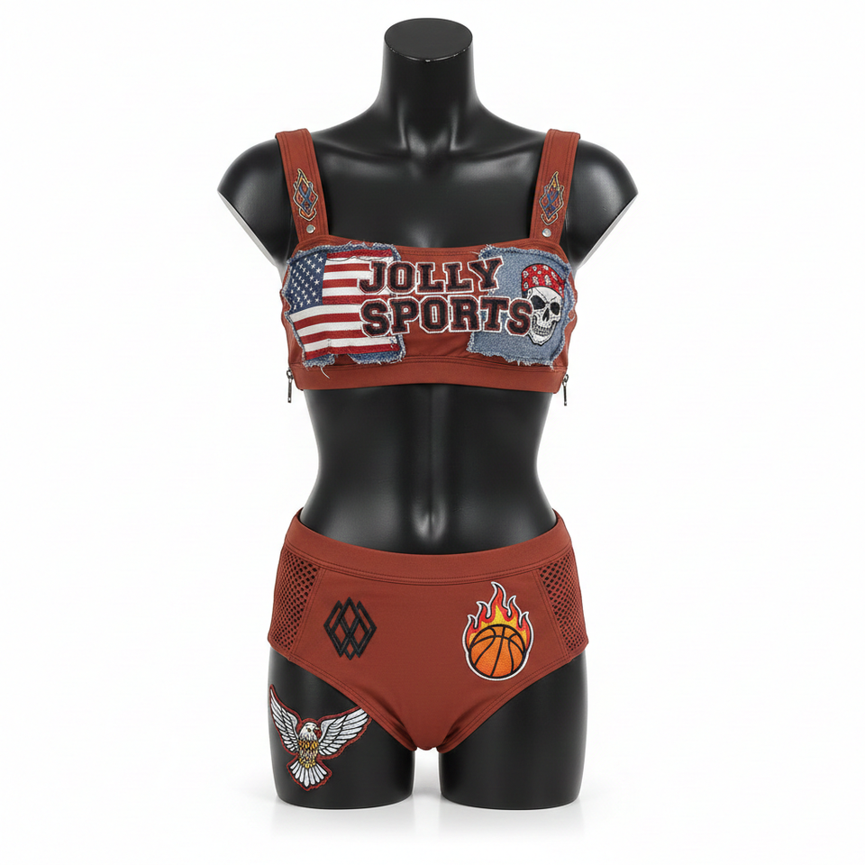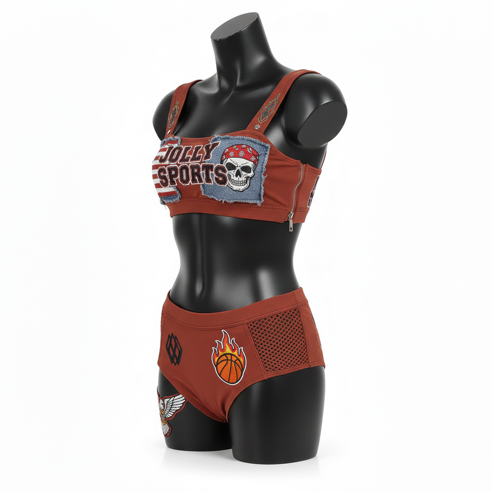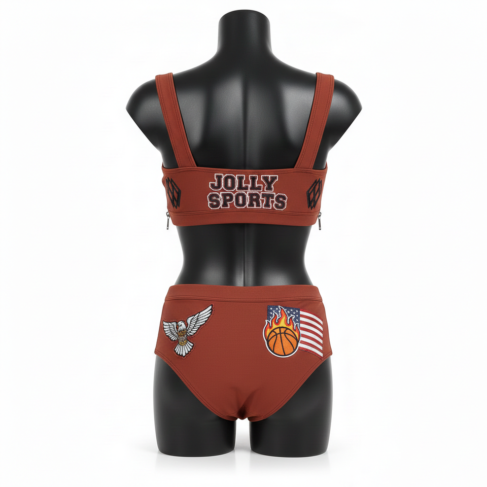 Women Bikini Set 220 GSM Smooth Polyester Spandex Rust Brown Mesh Side Panels Embroidery Patch Logo Women Bikinis