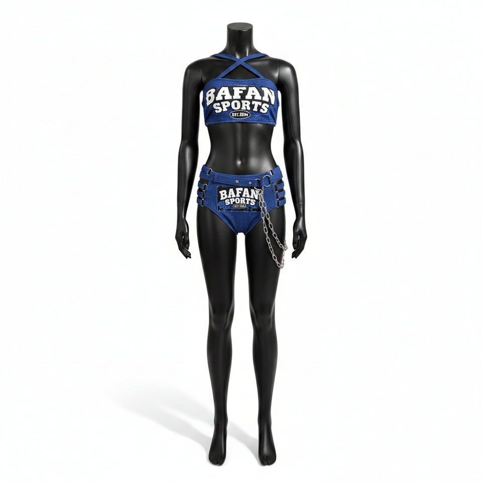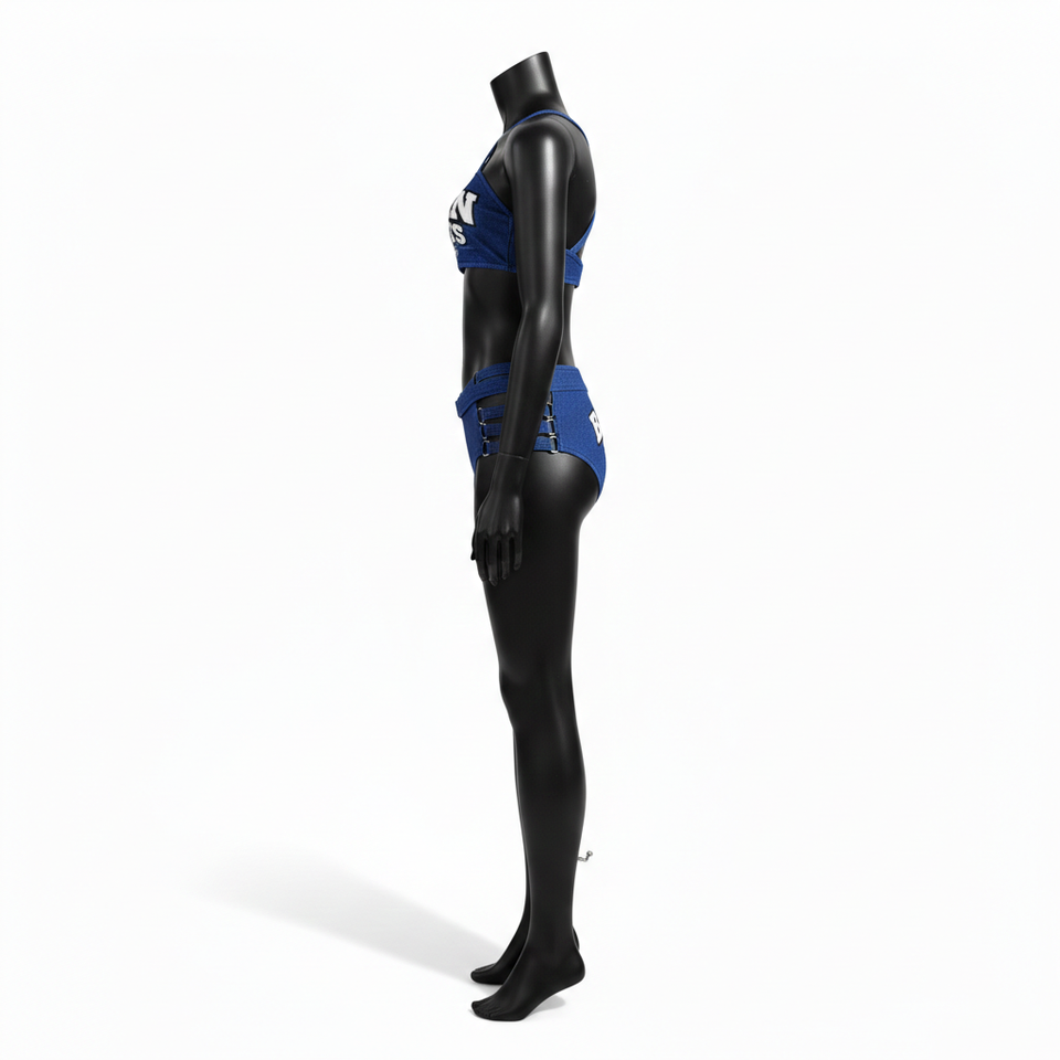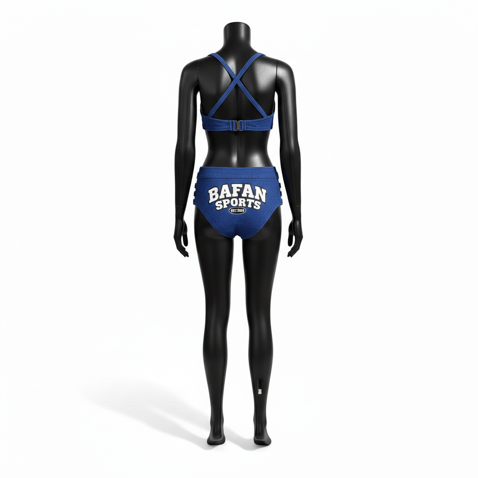 ชุดบิกินี่ผู้หญิง ผ้าไนลอนผสมสแปนเด็กซ์ สีน้ำเงิน ดีไซน์สายรัดด้านข้าง พร้อมโลโก้แบบรีดร้อนตามสั่ง