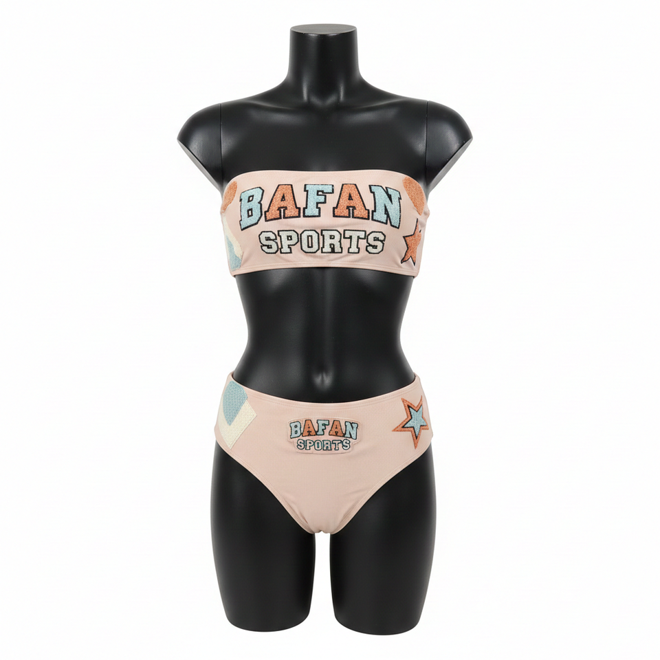 ชุดบิกินี่ผู้หญิง ผ้าไนลอนผสมสแปนเด็กซ์ เนื้อนุ่ม ยืดหยุ่น สีพีชนู้ด หลากสี ปักลายเชนีล ปักโลโก้ตามสั่ง ชุดบิกินี่ผู้หญิง