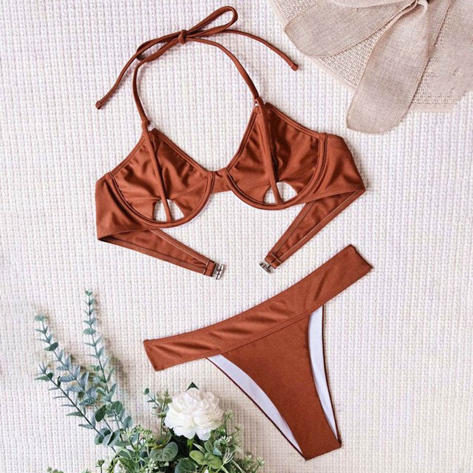 ชุดว่ายน้ำบิกินี่สำหรับผู้หญิงชุดบิกินี่สองชิ้นแบบแข็งตัดขนาดพิเศษชุดบิกินี่ทรงสามเหลี่ยมสำหรับผู้หญิงใส่โลโก้ได้ตามต้องการ