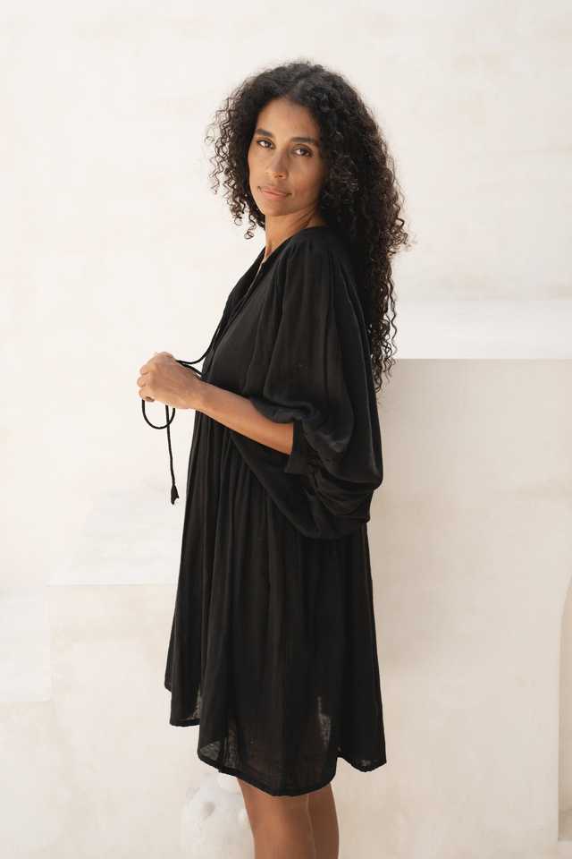 เดรสสั้นผ้าฝ้ายสีดำสำหรับผู้หญิง ทรงปกติ สวมใส่สบาย เหมาะสำหรับฤดูร้อน แขนเสื้อแบบดรอปโชว์เดอร์ เป็นมิตรต่อสิ่งแวดล้อม ซักได้
