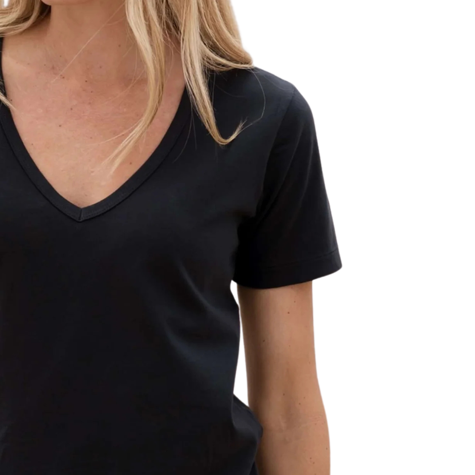 เสื้อยืดผู้หญิงสีดำ คอลึกทรงวี ผ้าฝ้ายออร์แกนิค 100% คุณภาพพรีเมียม ผ่านการรับรอง GOTS ยืดตัวน้อย ระบายอากาศได้ดี ทรงคลาสสิก