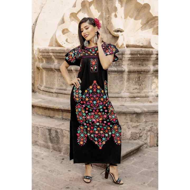 เดรสยาวผ้าฝ้าย 100% ปักลายดอกไม้สีดำสำหรับผู้หญิง ทรงเอวธรรมชาติ ซักได้ สไตล์พื้นเมืองเม็กซิกัน แขนสั้น ทรงหลวม