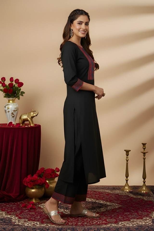 ชุดคุर्ติผ้าฝ้ายสีดำสำหรับผู้หญิง ทรงตรง แขนสามส่วน คอทรงกลม พร้อมกางเกงขายาวระดับน่อง เหมาะสำหรับชุดประจำชาติ
