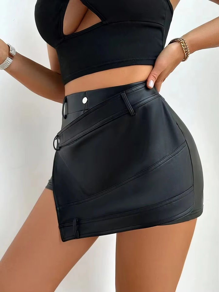 กระโปรงหนังสั้นเอวสูงทรงเอแบบไม่สมมาตรสำหรับผู้หญิง สีดำ เซ็กซี่ เหมาะสำหรับใส่ไปเที่ยวคลับหรือสตรีทแฟชั่น