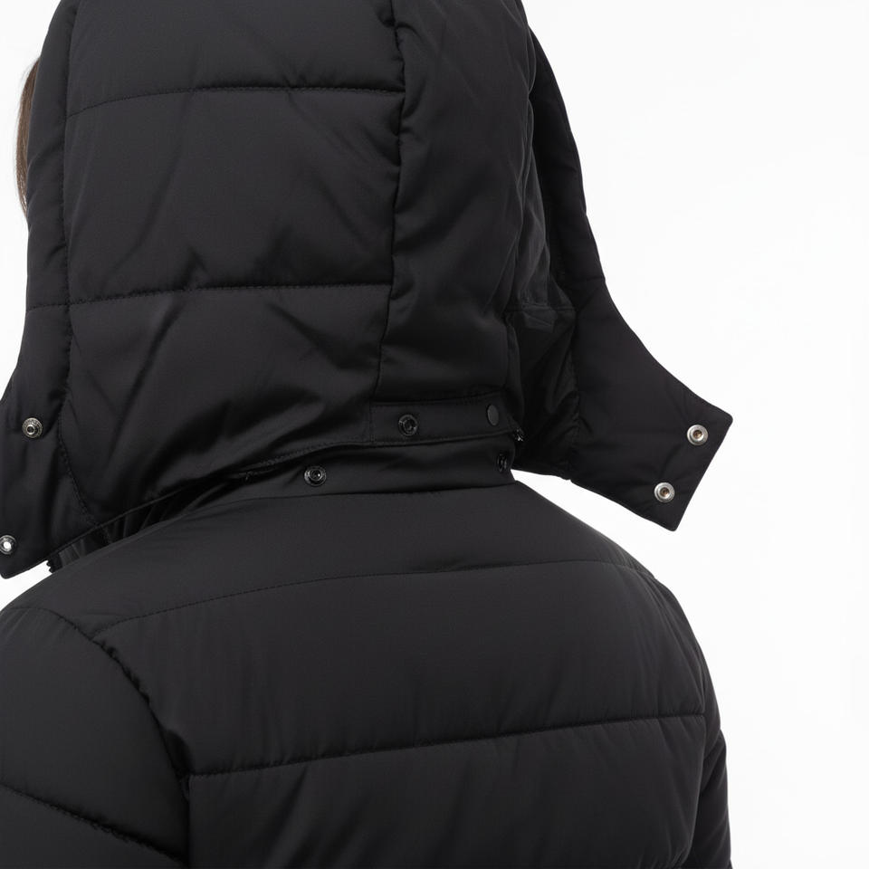 เสื้อแจ็คเก็ตผ้าแคนวาสแบบมีฮู้ดสีดำสำหรับผู้หญิง โรงงานผู้ผลิต OEM ขายส่ง รับผลิตตามสั่ง เสื้อผ้ากันหนาวแฟชั่นฤดูหนาวแบบเย็บติดกัน