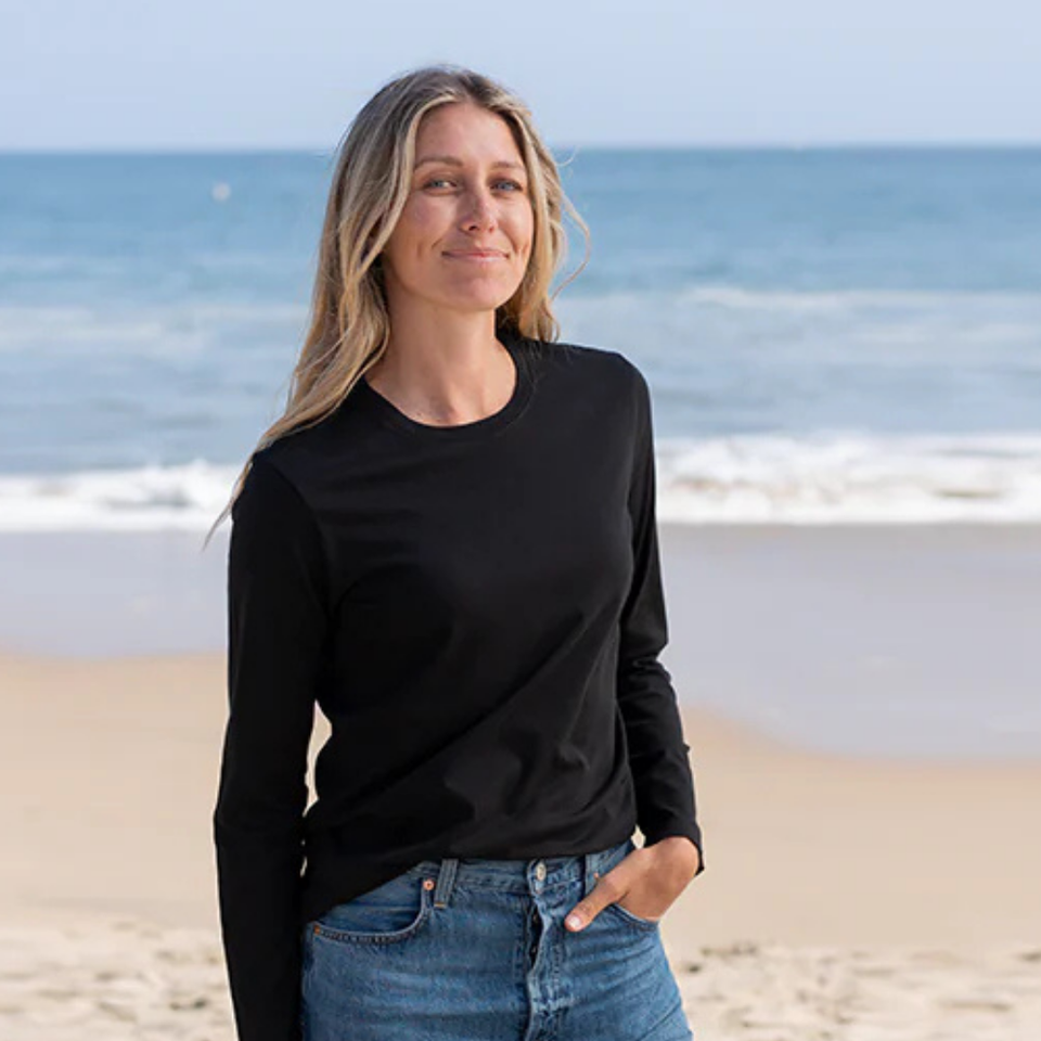 เสื้อยืดแขนยาวคอกลมสีดำสำหรับผู้หญิง ผ้าฝ้ายออร์แกนิคคุณภาพสูง 100% ผ่านการซักแล้ว ได้รับการรับรองมาตรฐาน GOTS เนื้อผ้านุ่มพิเศษ ทรงคลาสสิก