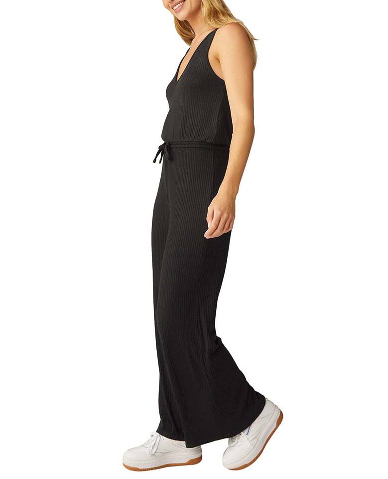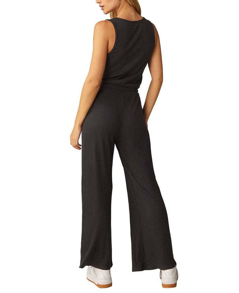 จั๊มสูทผู้หญิงสีดำแบบร่อง ผ้าริบ ไร้แขน คอวี ขากว้าง ทรงหลวม รัดเอวได้ ชุดออกกำลังกาย ผลิตแบบ OEM ขายส่งจากโรงงาน