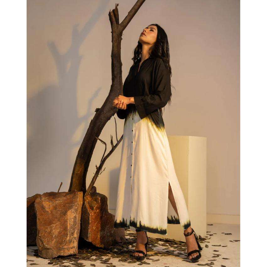 ชุดเดรสยาวสีดำขาวไล่เฉดสไตล์ชาติพันธุ์ผสมผสานแบบมักซีคุร์ตี พร้อมผ่าข้าง สำหรับใส่ลำลองหรือไปงานปาร์ตี้