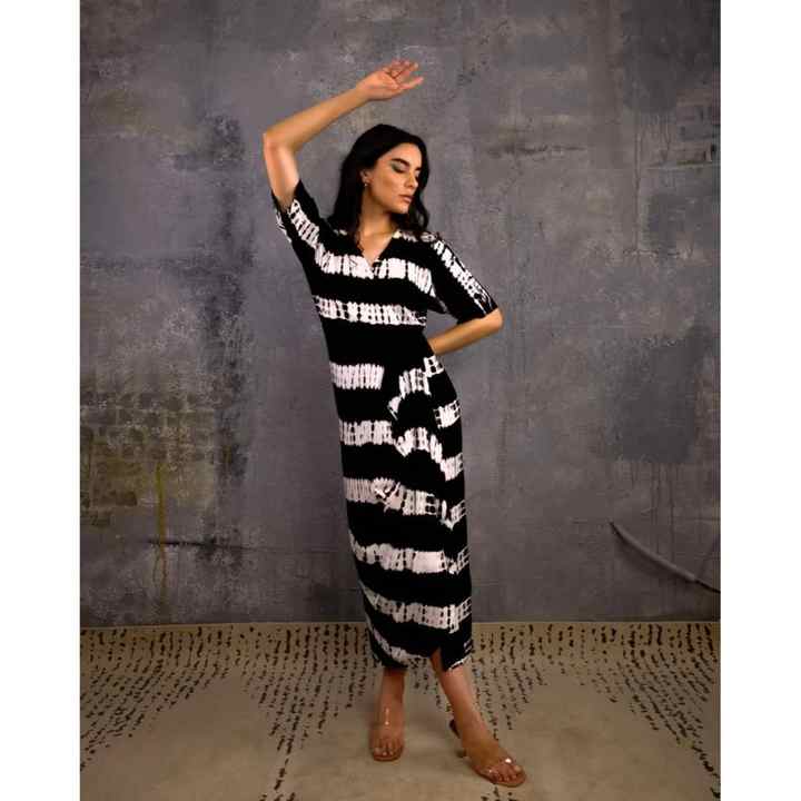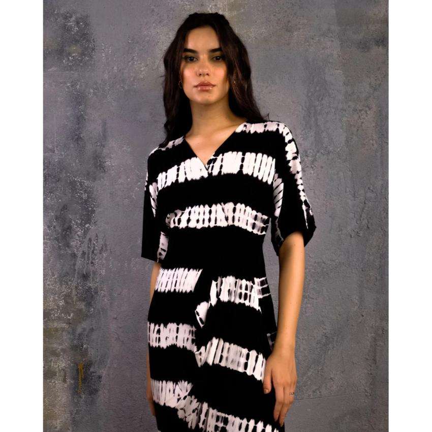 ชุดเดรสยาวสีดำขาว คอวี แขนบาน เอวธรรมชาติ สไตล์ลำลอง โมเดิร์น โบโฮ คาฟตัน เป็นมิตรกับสิ่งแวดล้อม