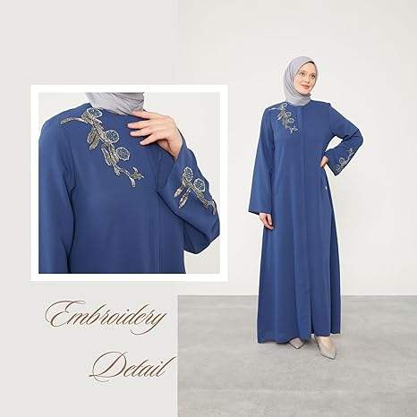 ชุดอาบายะห์สีน้ำเงินสำหรับผู้หญิง ผ้าโพลีเอสเตอร์ชีฟอง ปักลายด้วยคริสตัล งานปักแบบดั้งเดิมของชาวมุสลิม ชุดอาบายะห์สไตล์ตุรกี