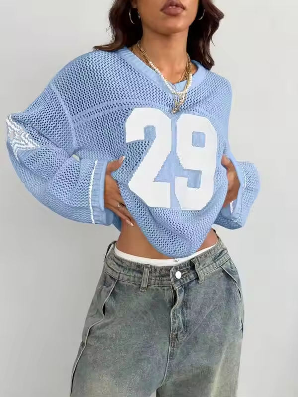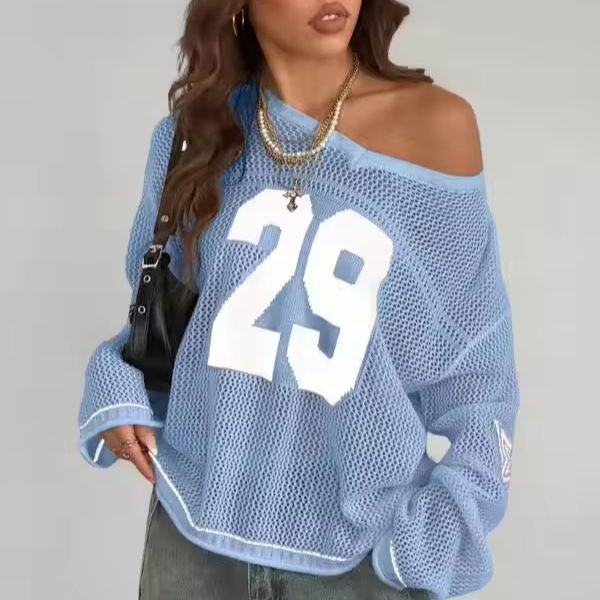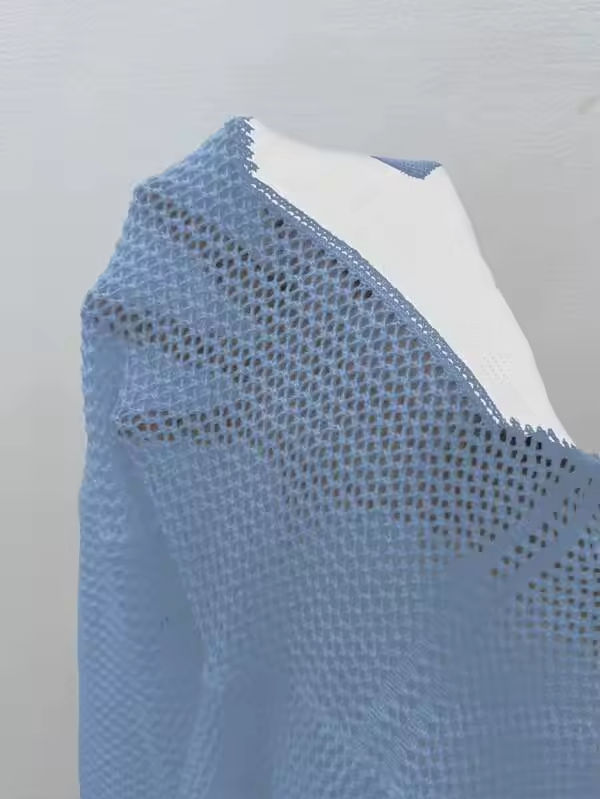 เสื้อสเวตเตอร์แบบสวมหัวสำหรับผู้หญิงเสื้อสเวตเตอร์แบบสวมหัวเสื้อสเวตเตอร์แบบสตรีทเสื้อสเวตเตอร์ถักเสื้อสเวตเตอร์ถักเสื้อสเวตเตอร์แบบคอกลมเสื้อเจอร์ถักลายตาข่ายสีน้ำเงิน