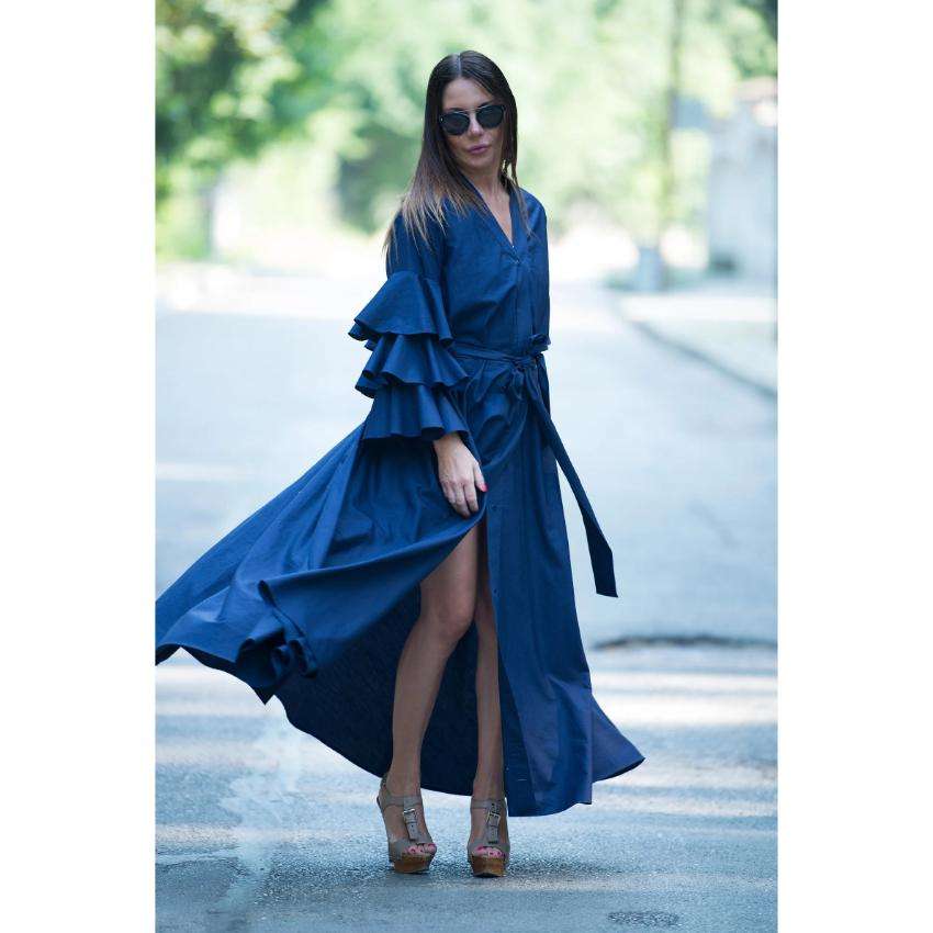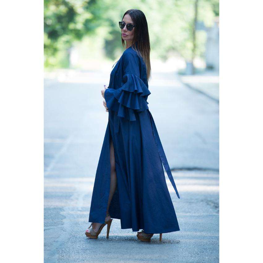เดรสยาวสีน้ำเงินสำหรับผู้หญิง แขนระบาย ผ้าเป็นมิตรต่อสิ่งแวดล้อม ซักได้ ทรงเอวธรรมชาติ แบบพันรอบตัว ยาวคลุมเข่า สไตล์คาฟตัน สวยสง่า เหมาะสำหรับใส่ลำลองหรืองานกลางคืน