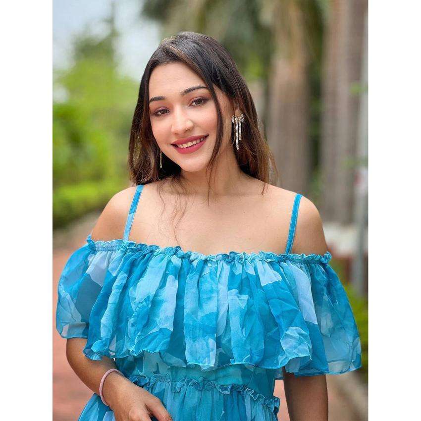 ชุดเดรสยาวสีน้ำเงินแบบเปิดไหล่สำหรับผู้หญิง ทรงเอ ตกแต่งระบายช่วงคอ วัสดุเป็นมิตรต่อสิ่งแวดล้อม เหมาะสำหรับงานปาร์ตี้ฤดูร้อน