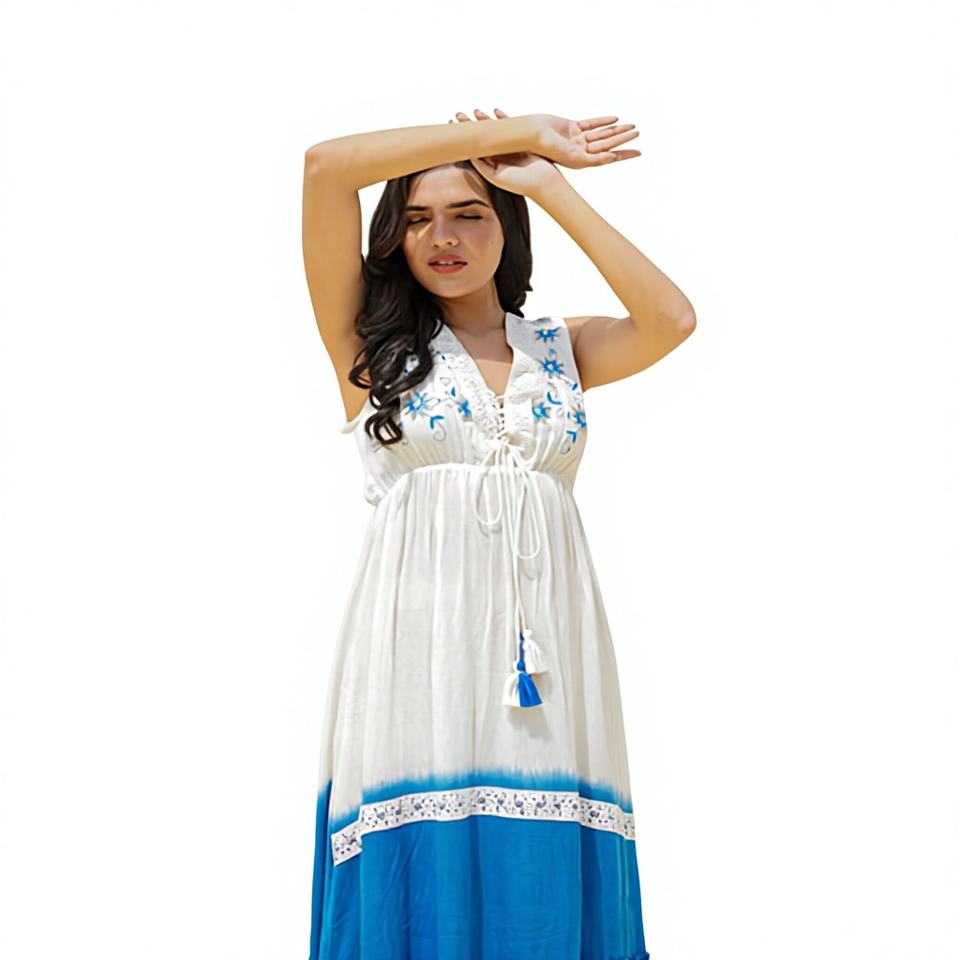 เดรสโบฮีเมียนผู้หญิงสีน้ำเงินขาวลายดอกไม้ คอวี เอวธรรมชาติ ผ้าฝ้าย 100% แขนพอง สวมใส่สบายๆ สำหรับกิจกรรมกลางแจ้ง