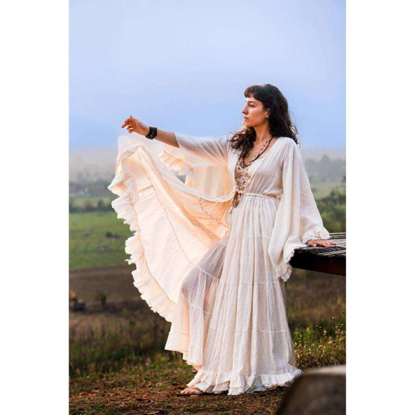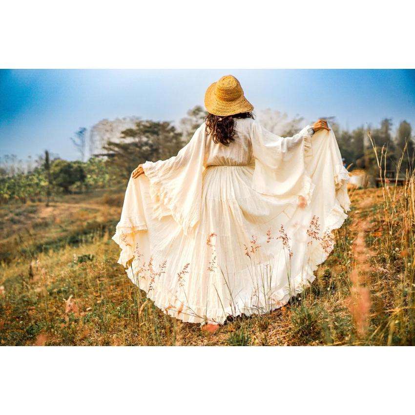 เดรสยาวสไตล์โบฮีเมียนสำหรับผู้หญิง แขนทรงระฆัง คอวี ผ้าฝ้ายเป็นมิตรต่อสิ่งแวดล้อม ซักได้ ผูกด้านหน้า เหมาะสำหรับงานเทศกาลสไตล์ฮิปปี้