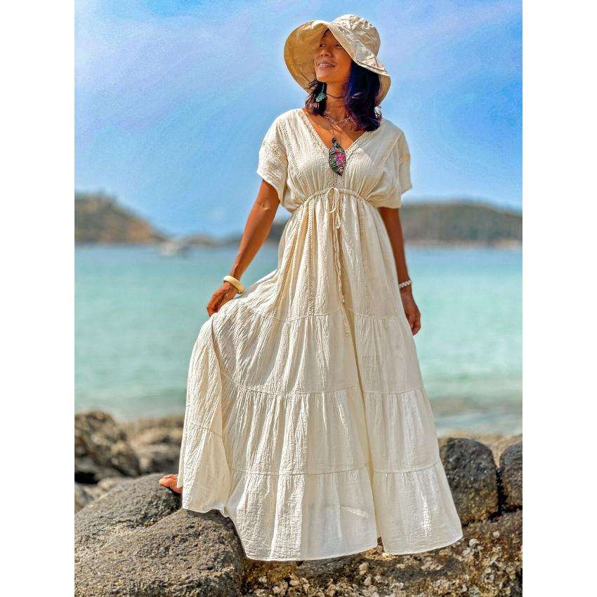 เดรสยาวสีขาวสไตล์โบฮีเมียนสำหรับผู้หญิง ชุดใส่ไปเที่ยวทะเลฤดูร้อน ผ้าฝ้ายธรรมชาติ ซักได้ คอวี รูดเชือกผูกเอว