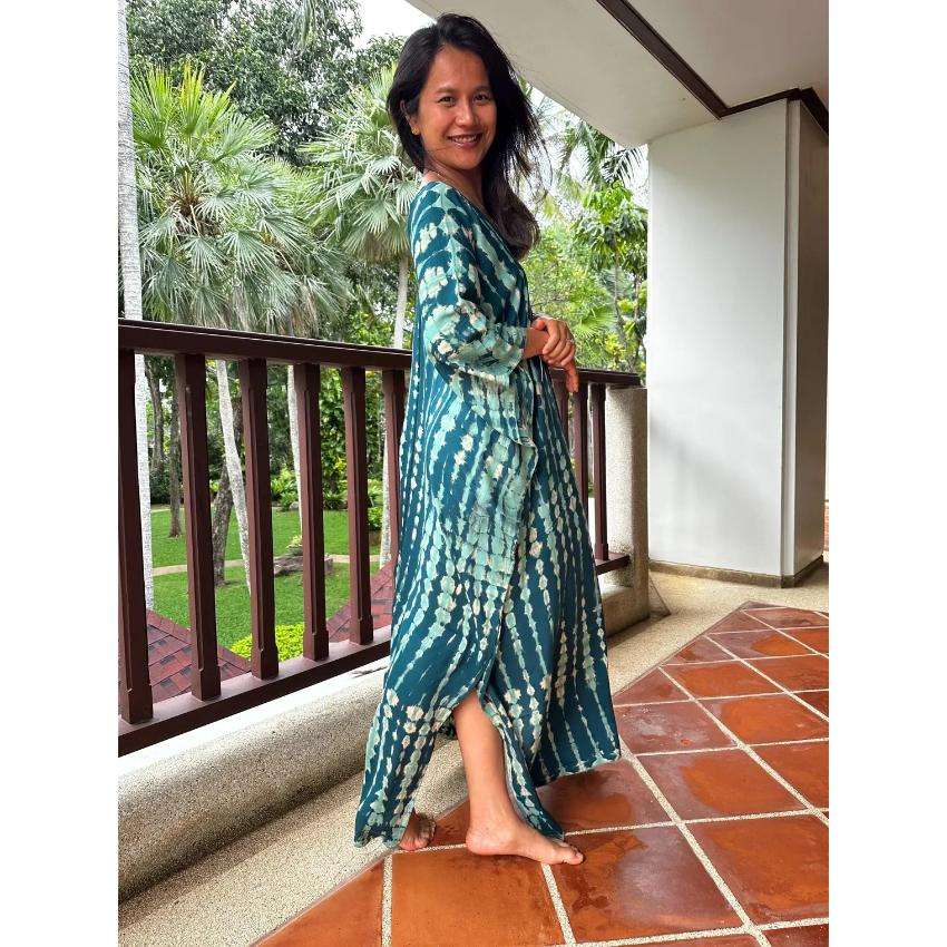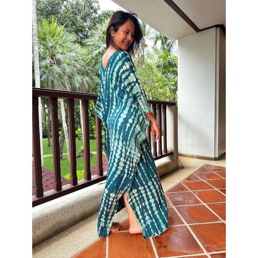 ชุดเดรสคาฟทันผู้หญิงสไตล์โบฮีเมียน ลายมัดย้อม ทรงหลวม คอวี ยาวแบบแม็กซี่ เอวธรรมชาติ ซักได้ เหมาะสำหรับใส่ไปเที่ยวรีสอร์ทหรือชายหาด