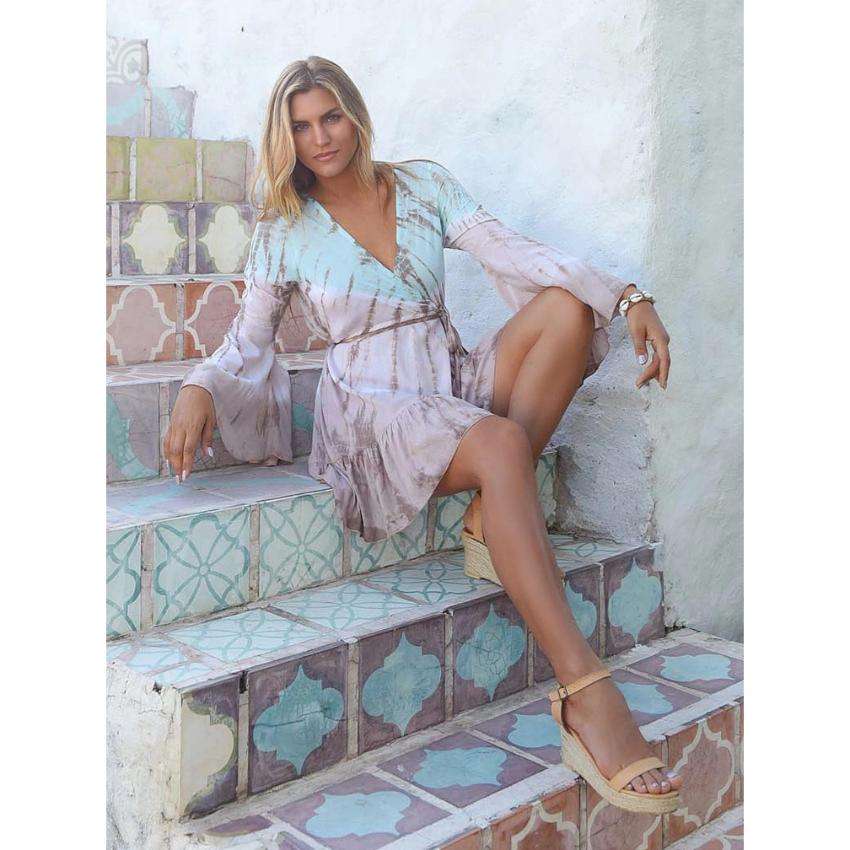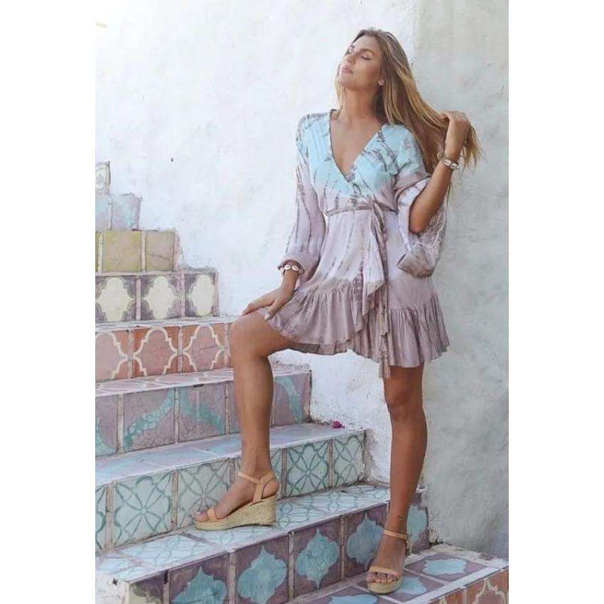 เดรสสั้นผู้หญิงสไตล์โบฮีเมียน ลายมัดย้อม คอวีลึก แขนยาว ชายระบาย เหมาะสำหรับใส่ไปเที่ยวทะเลช่วงฤดูร้อน