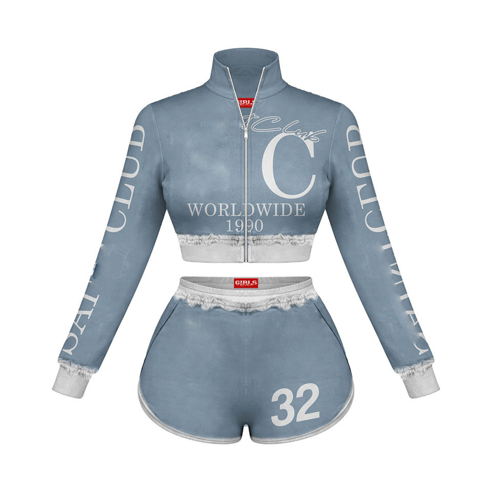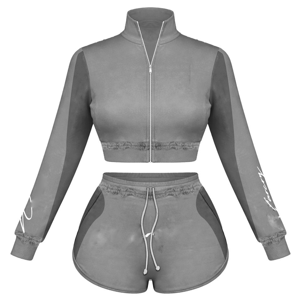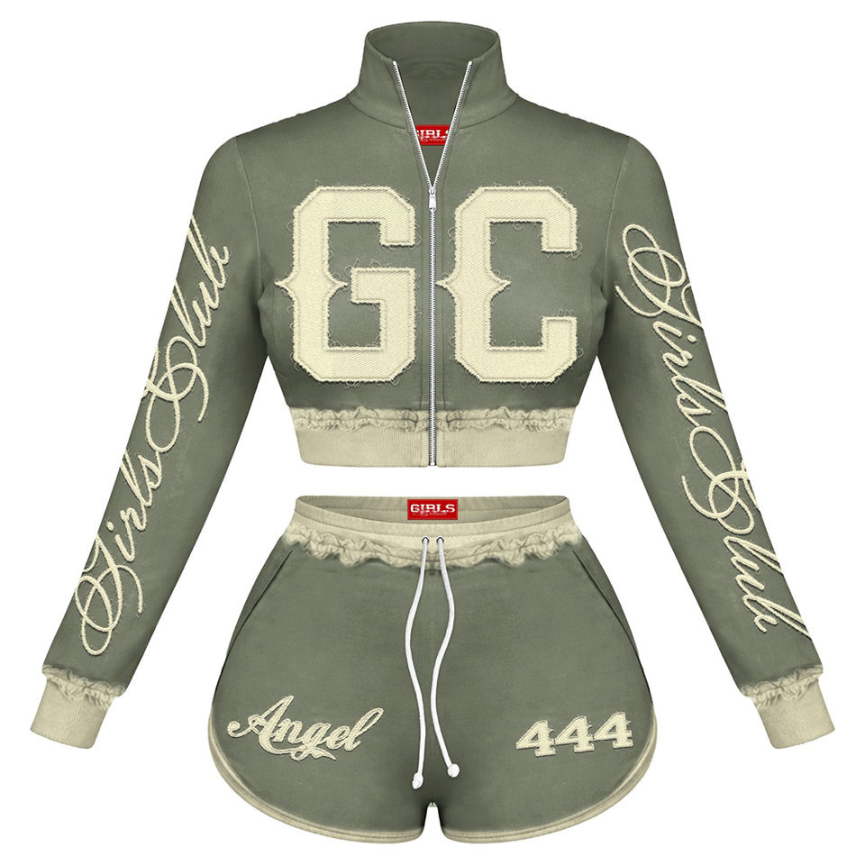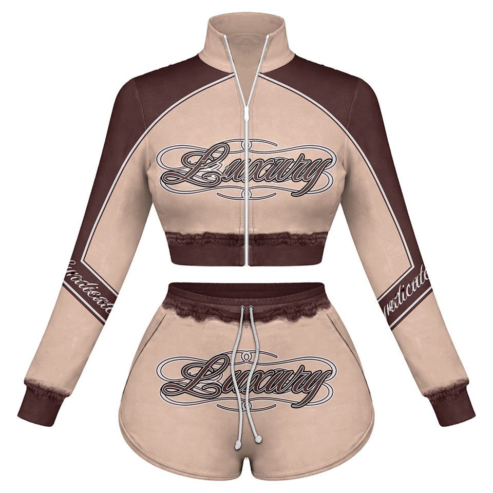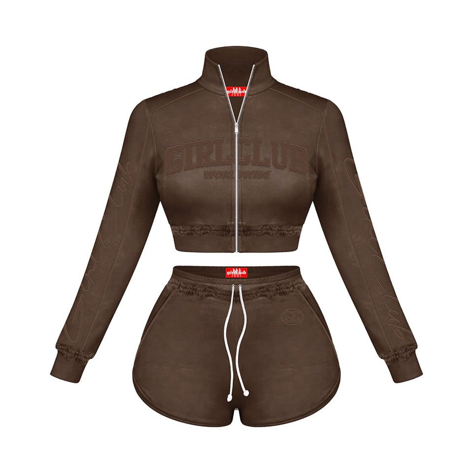 ชุดเซ็ตเสื้อครอปแจ็คเก็ตสีน้ำตาลผ้าฟลีซผสมคอตตอน 320 GSM พร้อมโลโก้ปั๊มนูน และกางเกงขาสั้นเข้าชุดสำหรับผู้หญิง