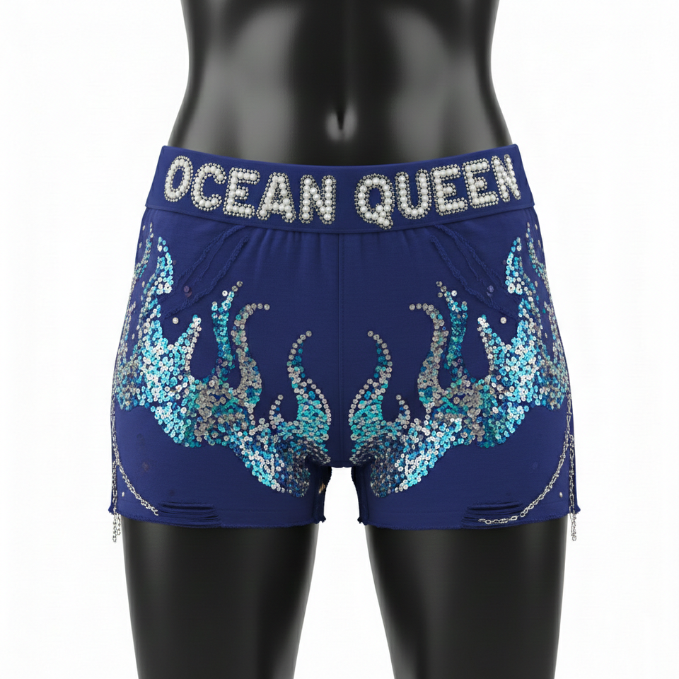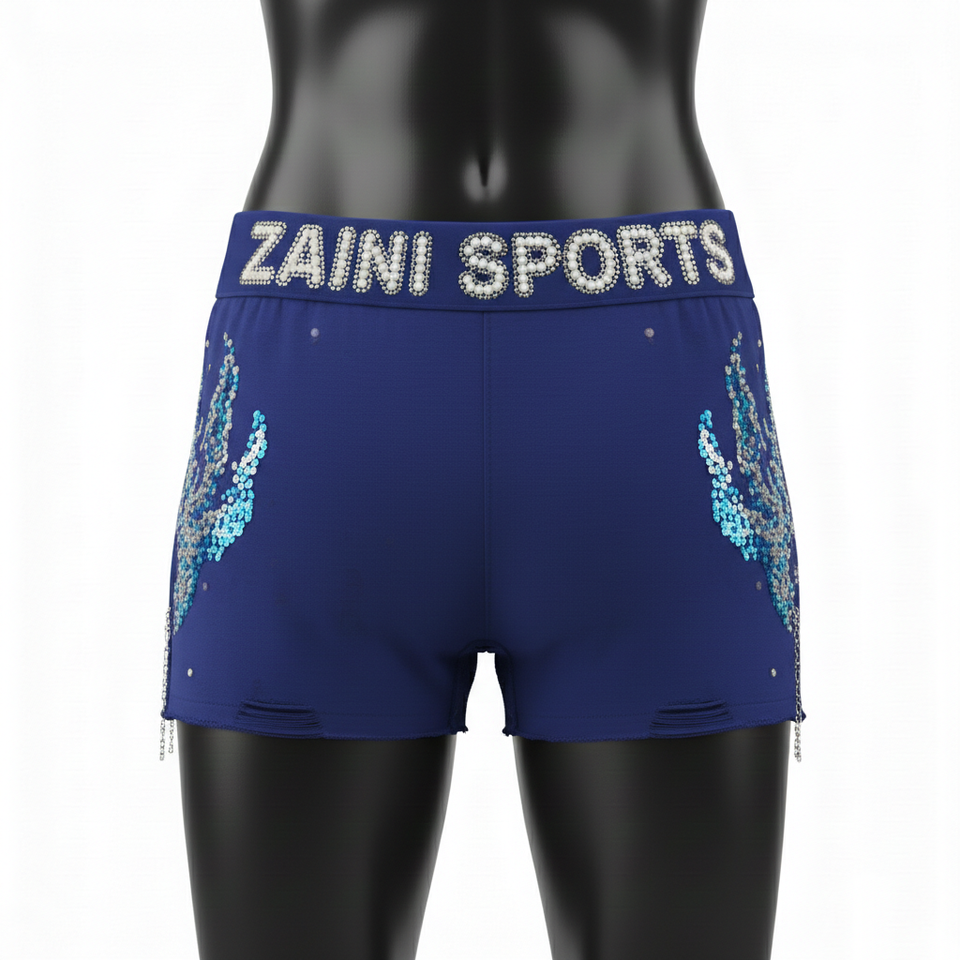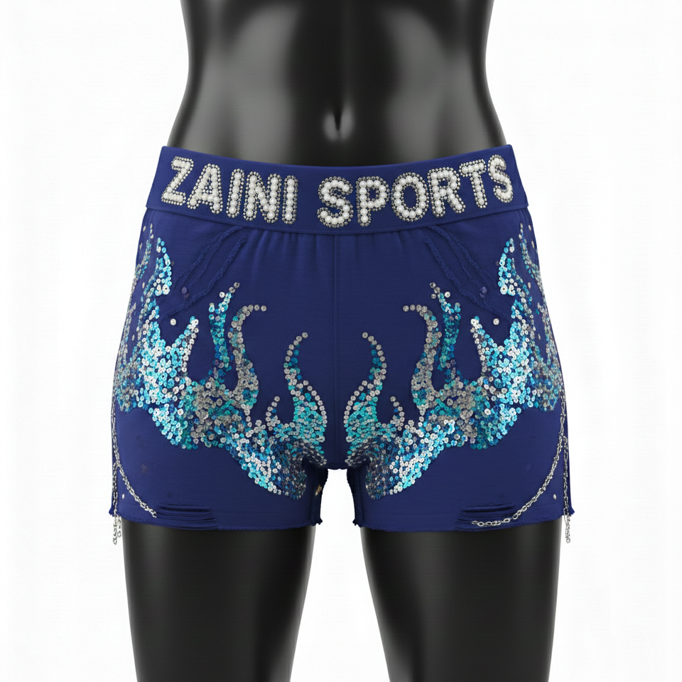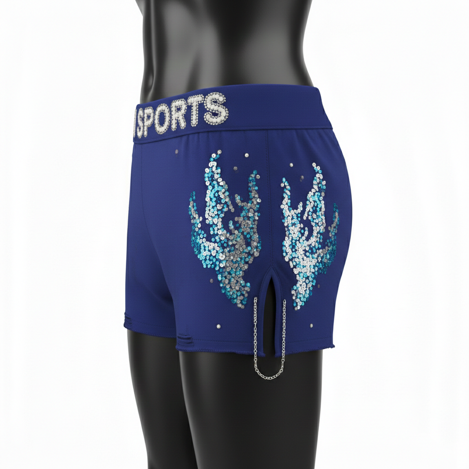 กางเกงขาสั้นผู้หญิงหรูหรา เนื้อผ้านุ่ม ยืดหยุ่นได้ ผลิตจากโพลีเอสเตอร์ผสมสแปนเด็กซ์ สีน้ำเงิน ประดับโลโก้ด้วยคริสตัลแบบ Hotfix