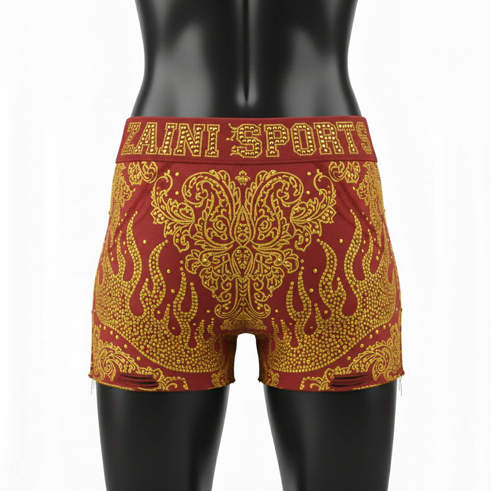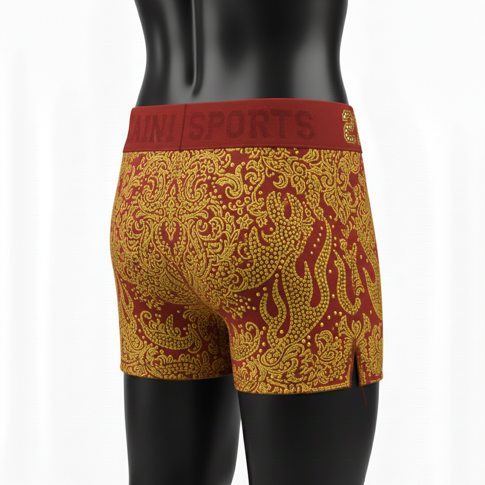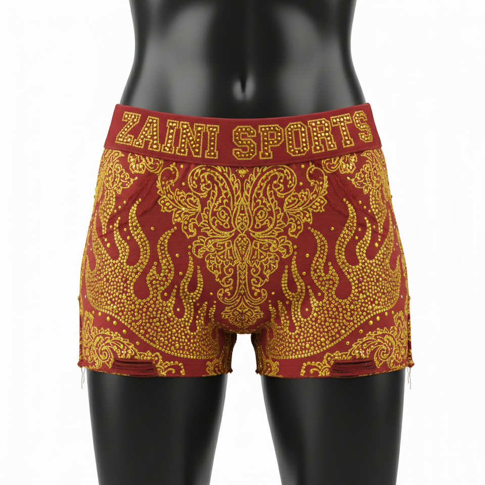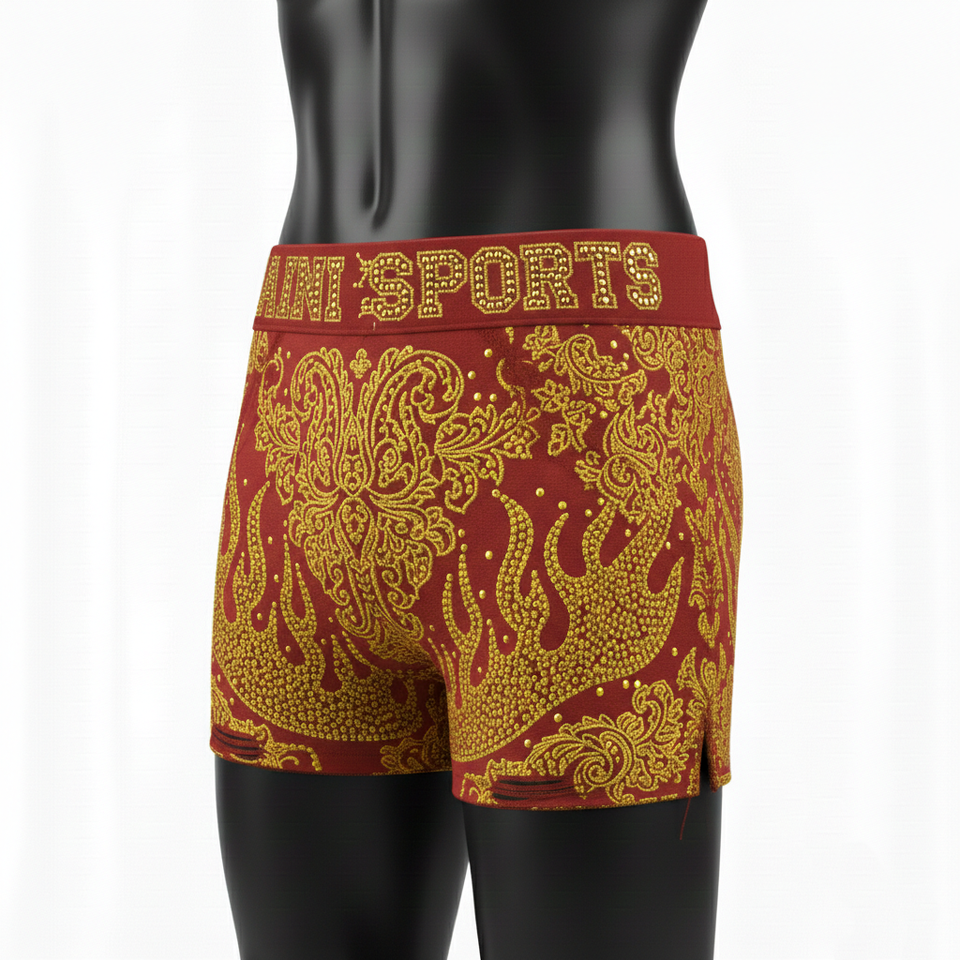 กางเกงขาสั้นผู้หญิง ผ้าคอตตอนผสมอีลาสเทน พรีเมียม สีแดงเลือดหมู ประดับคริสตัลสีทอง รับสกรีนโลโก้ตามแบบ